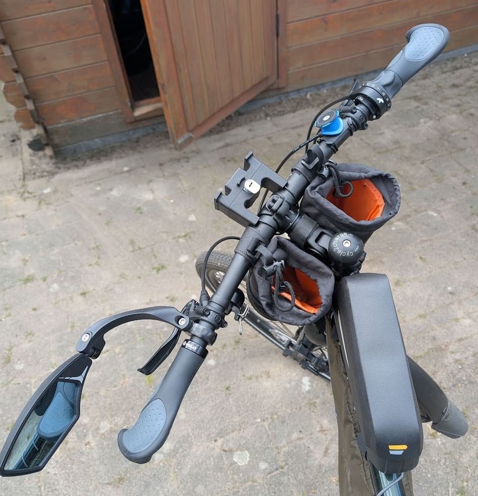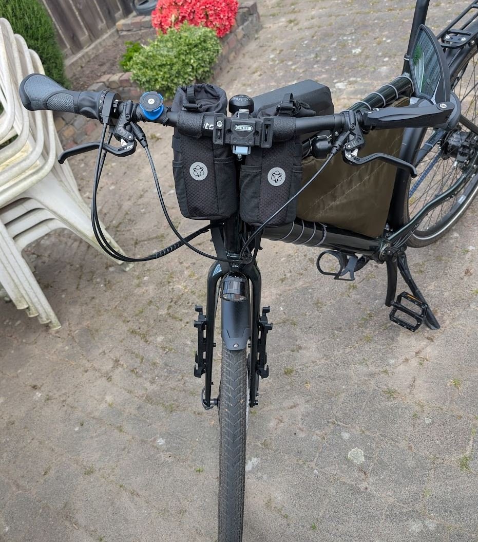Hierbij moet mijn ortlieb classic tas nog passen, net als de rest van de zaken die er nu opzitten excl de spiegel want hiervoor wil ik een kleinere aan het uiteinde van de grips. De grips ga ik vervangen voor ergon gp1/gp3.