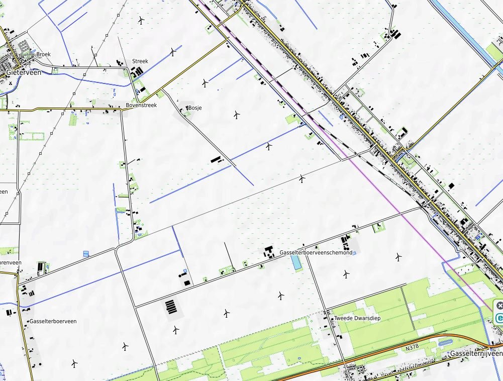 Ongeveer 50 meter over de spoorbaan ben je zo in Drenthe. De windturbines stonden er in 2010 nog niet.