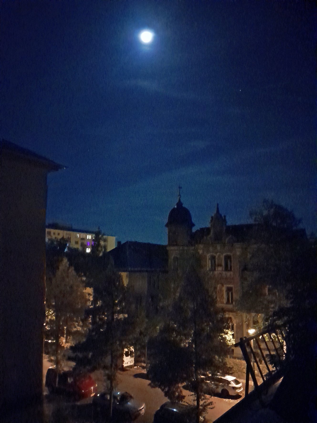 De foto is bij volle maan vanuit mijn kamer genomen. Er is wel Streetview aanwezig voor het huis met het torentje. Maar waar? Wel een grote stad.