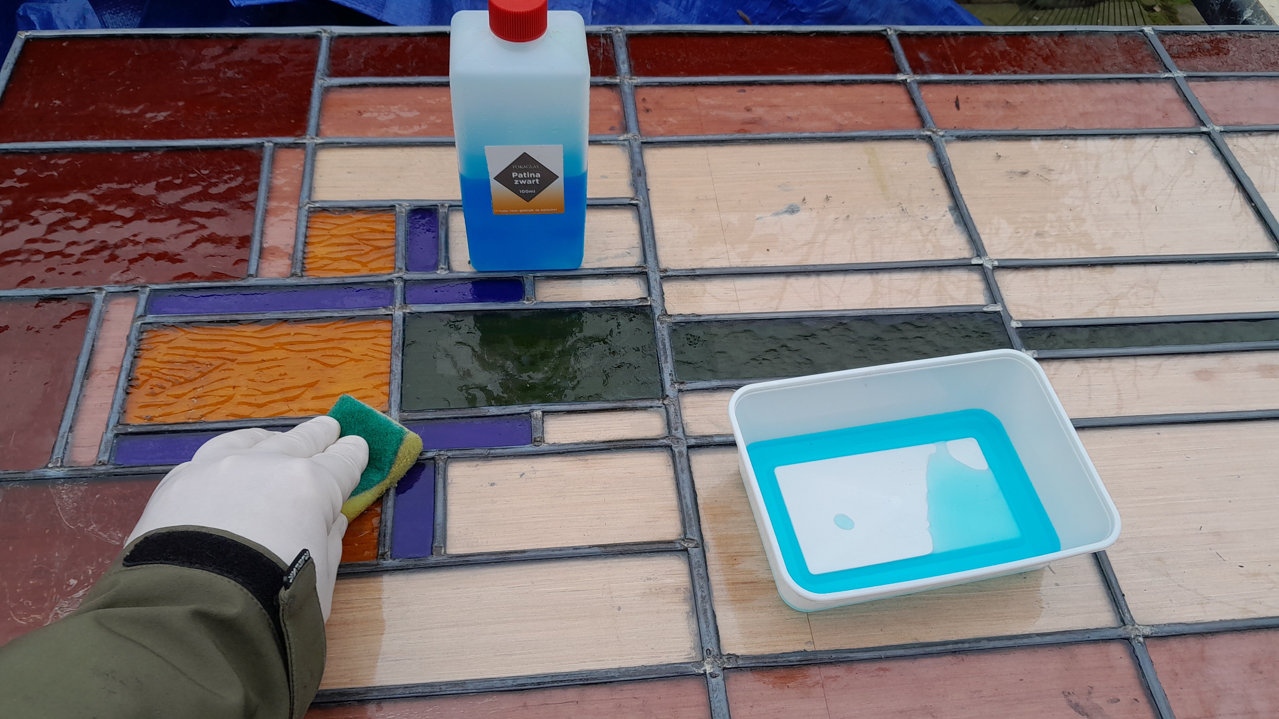 Eerst het glas-in-lood raam donker patineren (aan beide zijden) dan kom ik straks terug. Is giftig spul, daarna wassen. Morgen gaat het regenen!