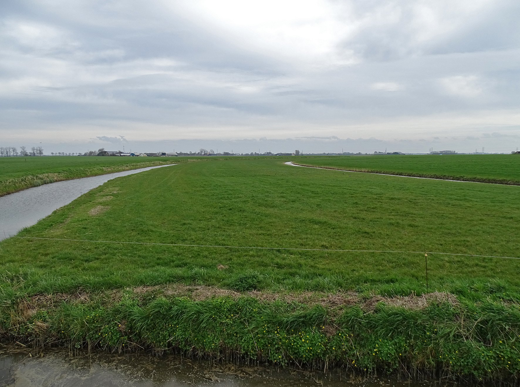 Hier vanaf de Garnwerderweg even ten zuidwesten van Winsum gezien, richting Wetsinge. De middelste strook land tussen de twee sloten ligt lager dan de rest. Nóg mooier te zien op Google satelliet, helemaal ongeveer tot bij de witte spoorbrug over het Van Starkenborgkanaal.