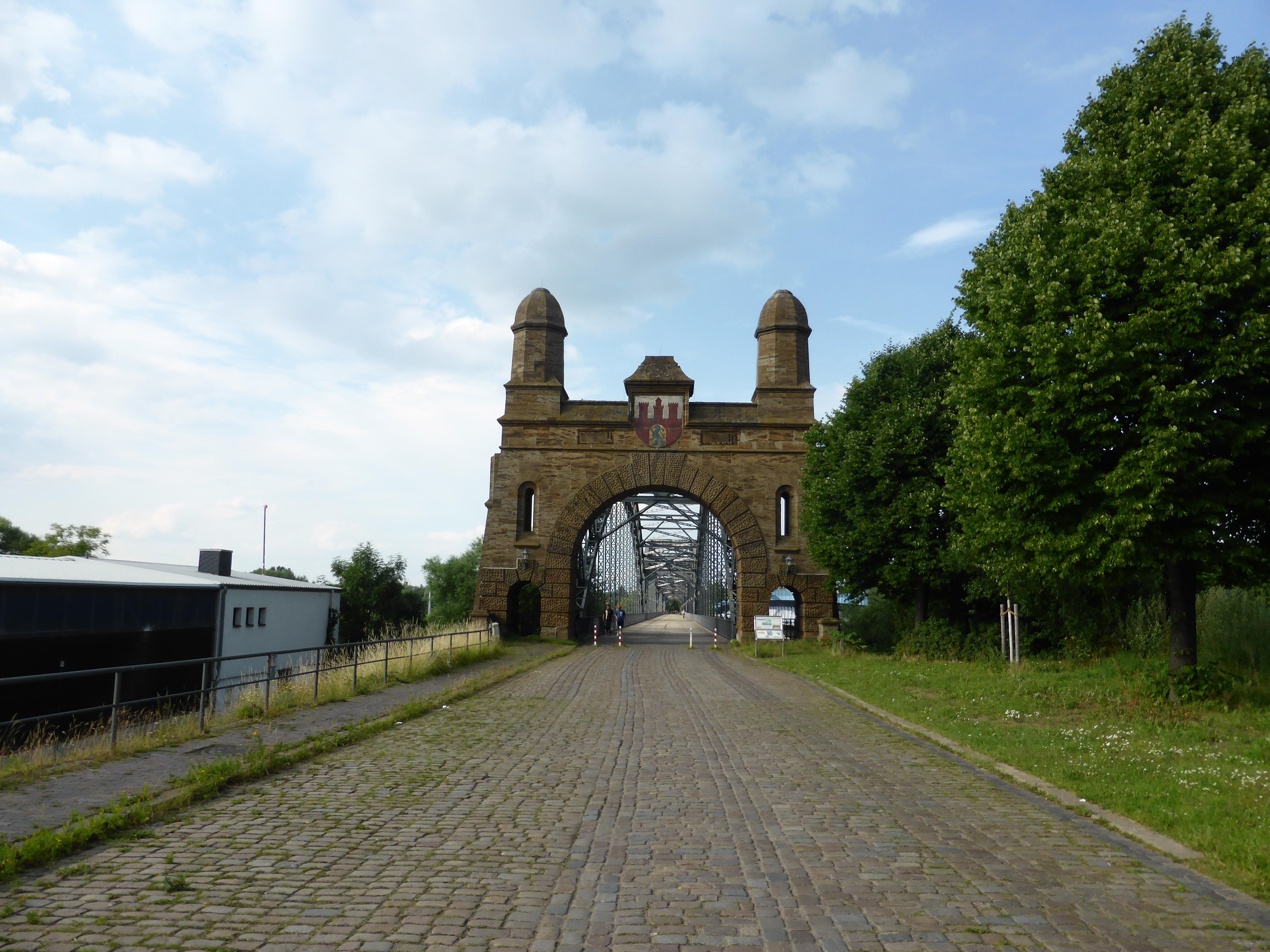 Alte Stahlbrücke mit Steintor in Deutschland