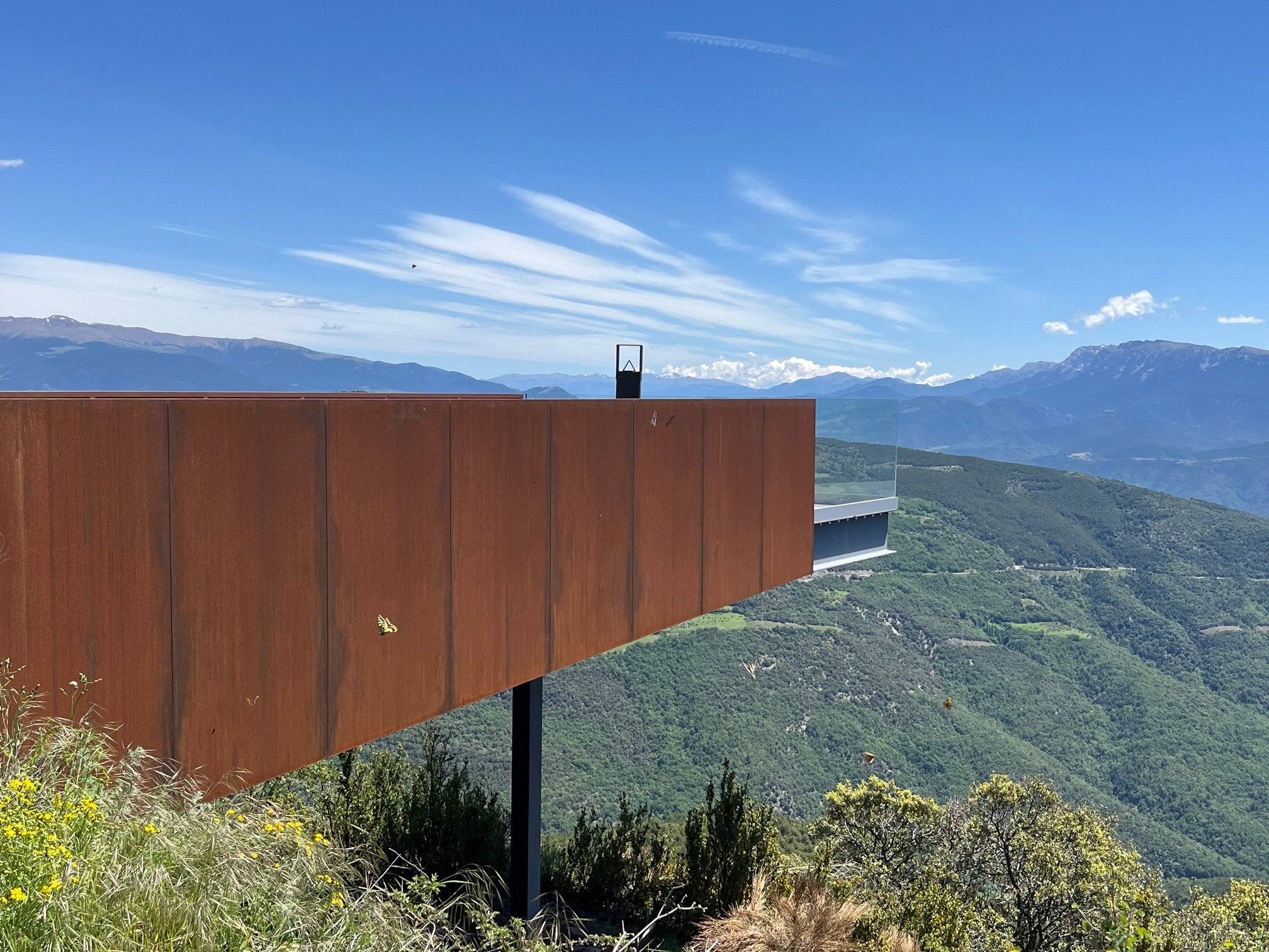 Ja, dat is hem. Zo'n balk van 15 meter met een het einde een glaswand rondom voelt heel geëxponeerd. Ik zag daar mensen voorzichtig over de rand kijken. Het paaltje met kader en omgekeerde V is voor de camera.