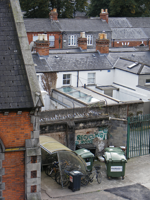 Misschien heb ik het te makkelijk gemaakt, inderdaad Dublin en de naam van de kerk klopt, in de verte zijn de heuvels van Wicklow Mountains te zien. De kapel op de voorgrond met rode vorstpannen is de eetzaal van de jeugdherberg, zoiets als in de Harry Potter-films, met helaas geen zwevende kaarsen maar kille TL-bakken.... De jeugdherberg van Dublin was vroeger een convent school voor jongens in kloosteropleidingen.