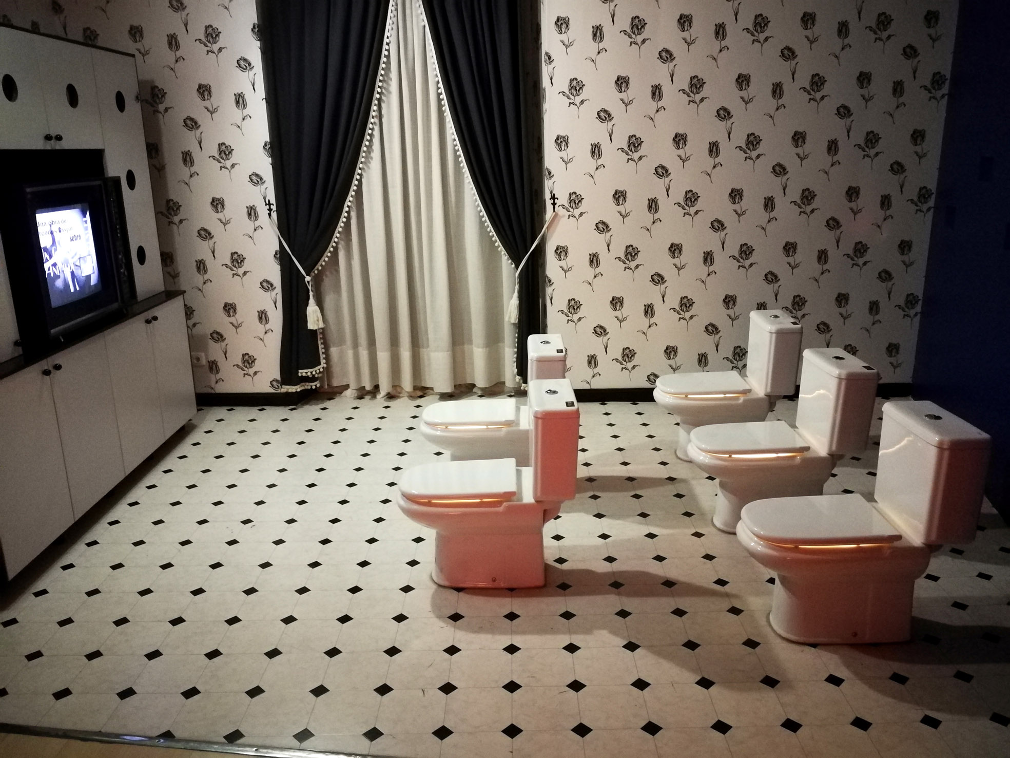 De closetpotten zijn niet eens aangesloten en er brandt licht onder de brilkleppen....