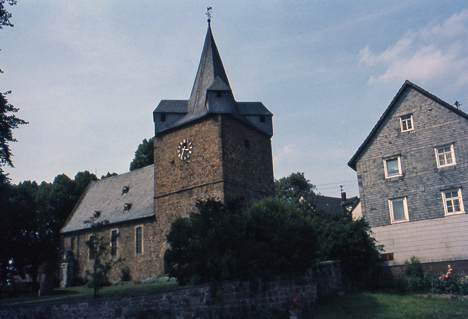 Duitsland? De huizen zien er zo ongeveer Duits uit. Een groot zonnepark linksboven van het rode dak. De kerktoren rechts doet me denken aan Sauerland, met op de vier hoeken een soort van uitkijkposten of schietgaten, zoals bijgaand voorbeeld hieronder. In deze omgeving heb ik meer "defensieve" kerktorens gezien. Maar waar ik deze foto heb gemaakt weet ik niet meer, het was lang geleden, in 1980.
