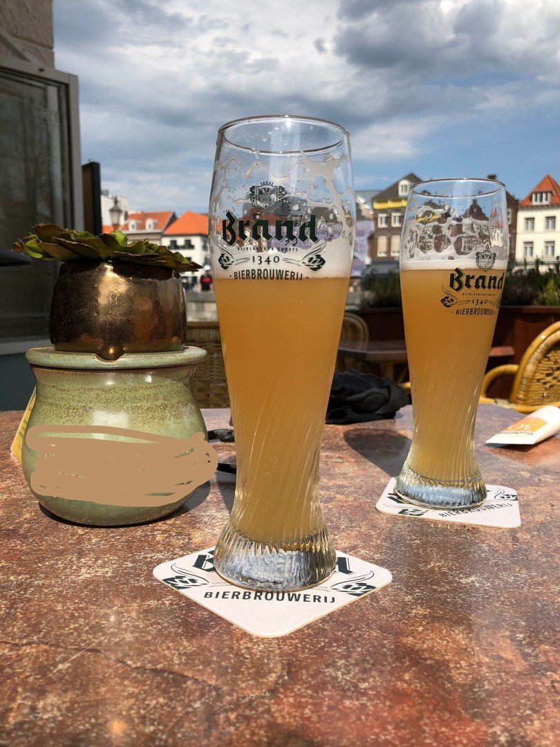 Gezien dit biermerk dacht ik meteen aan Limburg. De ruimte tussen hier en de huizen aan de achtergrond lijkt erg breed. Een rivier o.i.d.? Maastricht kan niet, want in het zuiden liggen de daken van oude huizen meestal evenwijdig langs de straatkant. Zag ik tussen het voorste bierglas en het koperen potje een stukje mergelstenen kademuur. Dan schoten mijn gedachten meteen iets noordelijker, naar Roermond. En ziedaar!