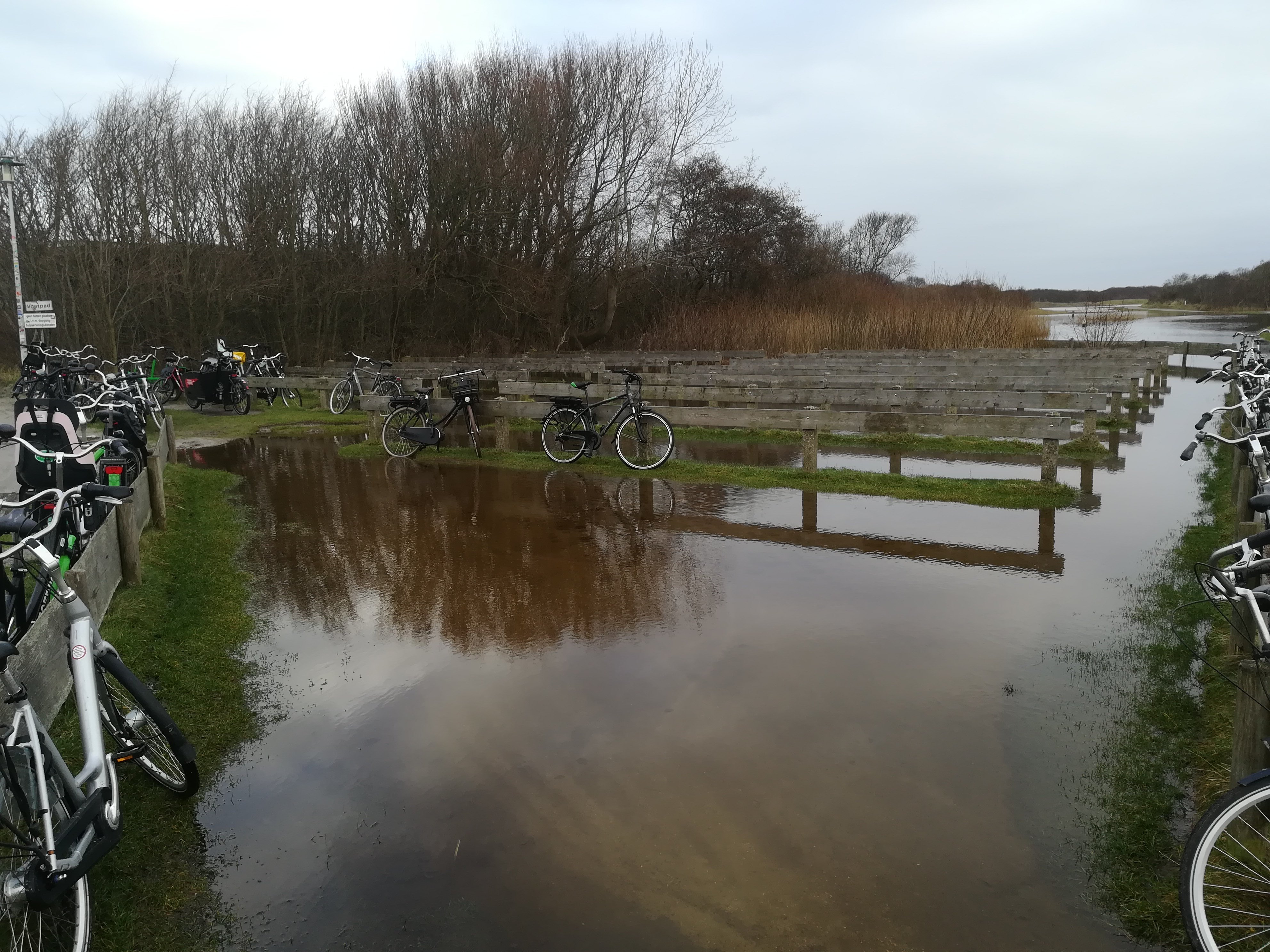 Ziet eruit als een fietsenstalling maar waarvan? Een recreatiepark met restaurant aan het water? Moet wel veel klandizie hebben.