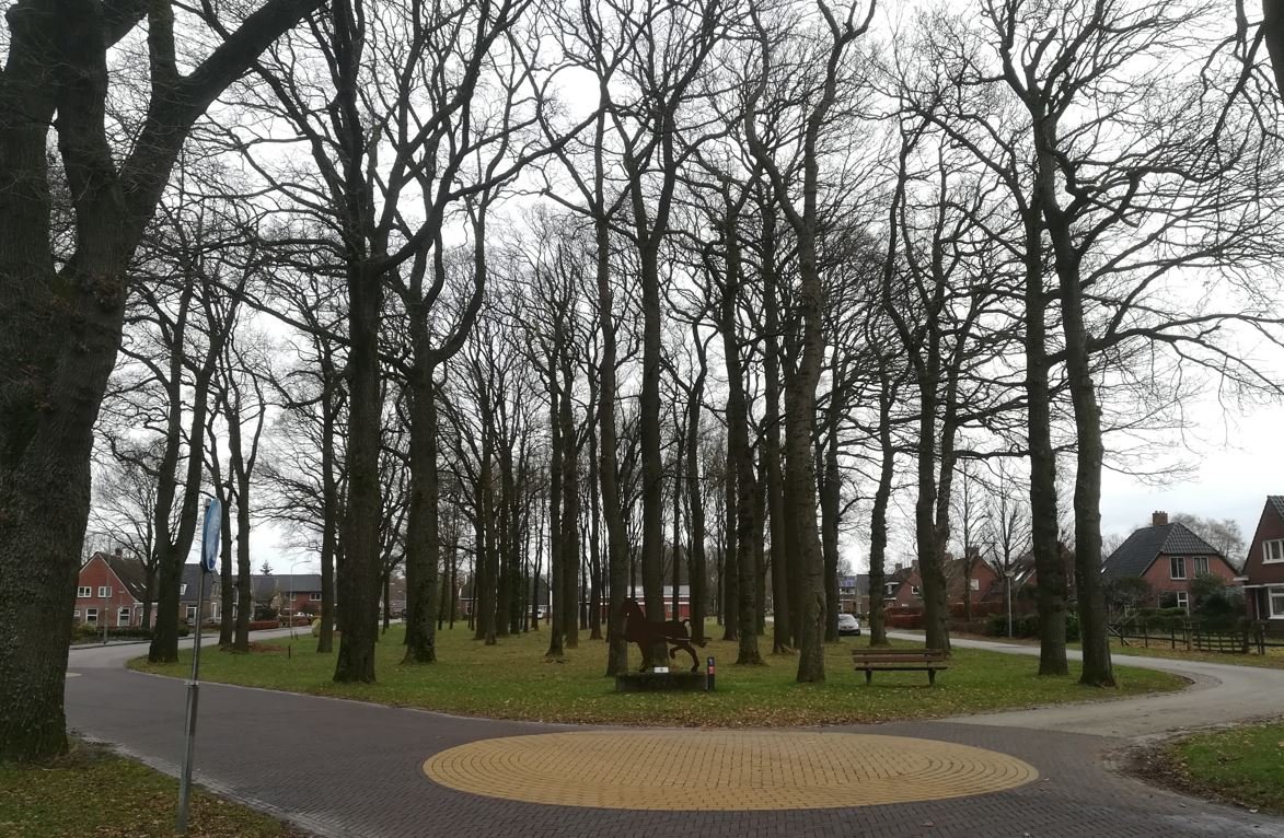 Lijkt me een Drents brinkdorp, het paard vooraan - daar moet ik misschien aan Zuidlaren (de beroemde paardenmarkt) denken, maar kon die plek niet vinden, de gele stip moet toch makkelijk op satelliet te zien zijn? De straat naar links is meer doorgaand dan de straat rechts voor lokaal verkeer.