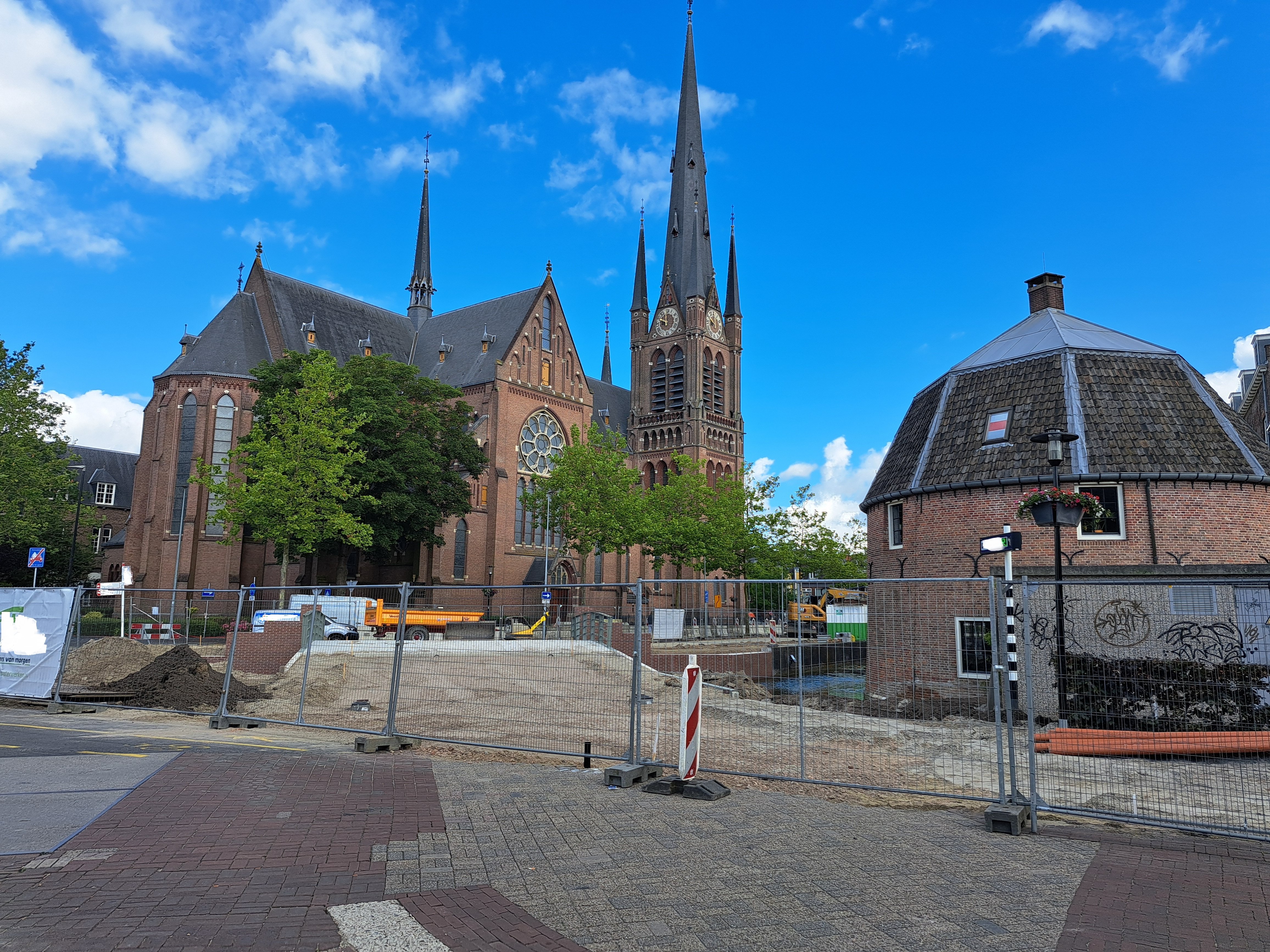 Toch verdraaid lastig, een mooie katholieke kerk die niet te googlen valt. Vier Doornik-achtige hoektorentjes (zowat identiek aan die afgebroken RK-kerk in Alkmaar). Gebouwd rond 1890 of daaromtrent met vooroorlogse toevoegingen. Aan de staat van onderhoud te zien aan de erediensten onttrokken. Glas-in-lood ramen verwijderd. Dacht ik aan Wijchen, Bergharen en die tegenover André Rieu, maar zijn ze niet.