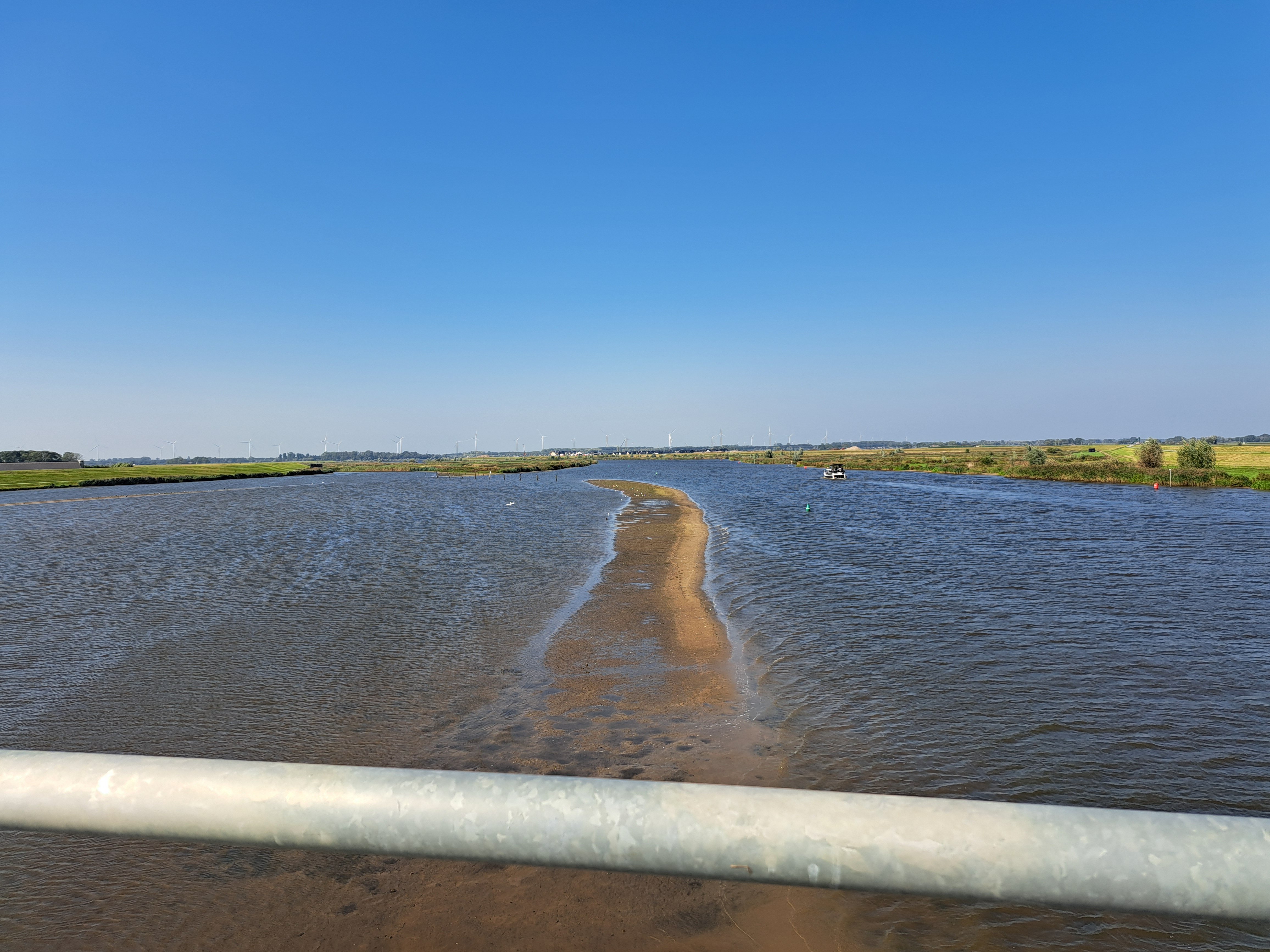 Best een lastige foto. Zandbanken en de brug is te laag voor de drukke scheepvaart als het op de Nederlandse rivieren is. De witte huizen met donkere daken in de verte. Dacht ik meteen aan de Loire in Frankrijk. Vanaf Nantes stroomopwaarts van pont tot pont op Streetview gecontroleerd totdat de rivier smaller wordt. Ook gelet op de witte buis van de brugreling. Mais non! De Seine is goed bevaarbaar. De Rhône geprobeerd, maar de kleur van het water is daar anders en de landschappen zijn te zuidelijk van aard. Meer rode daken.