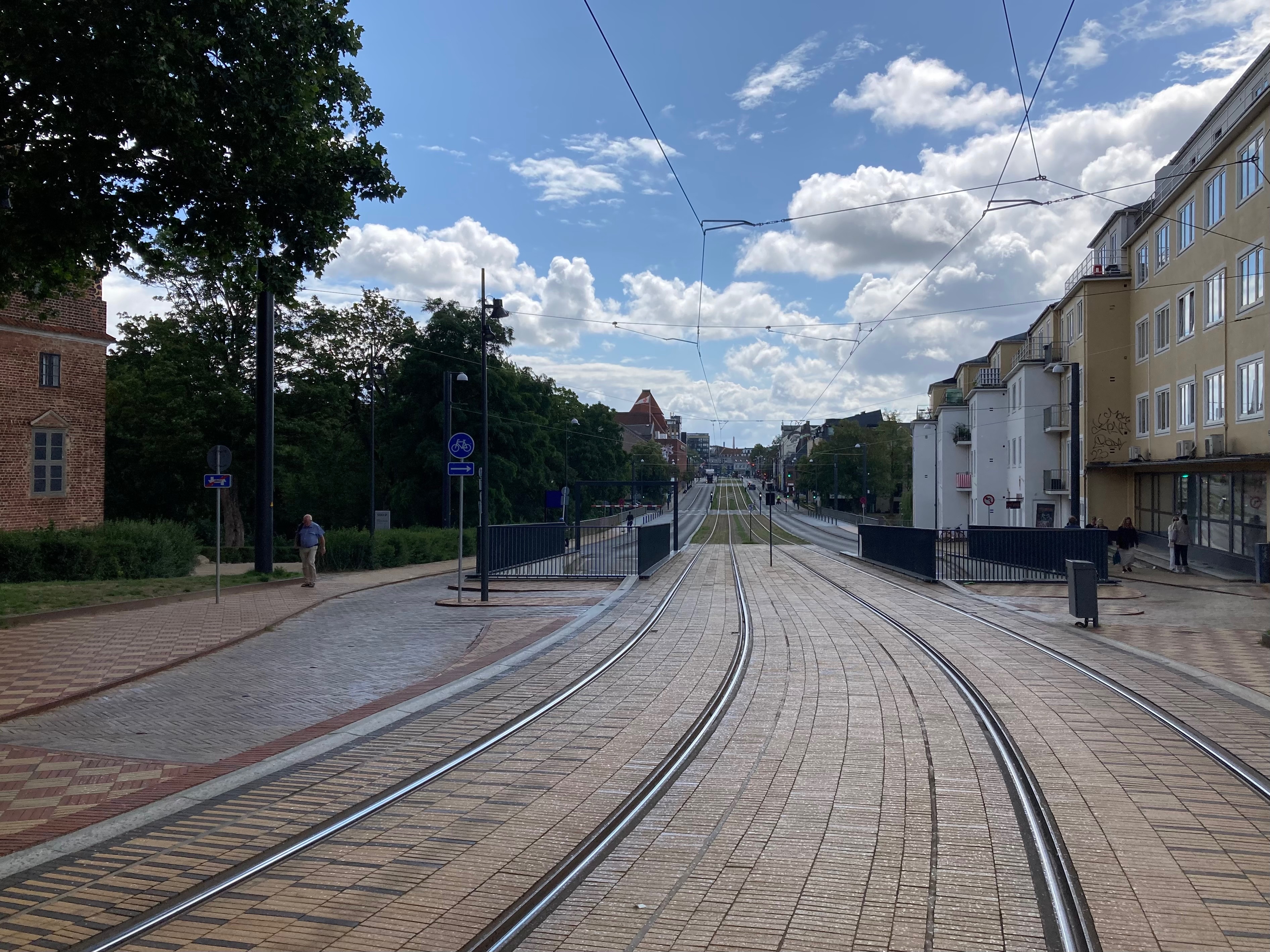 Die richel met de dakpannen daarboven kwam ik wel eens tegen bij diverse kerken of kastelen in Denemarken. Dat typische metselwerk. Ik had gewoon mazzel dat ik na twee straten "satellietzoeken" naar de tramrails de juiste plek in Odense heb gevonden. Vooral dat hoge rode puntdak viel me meteen op.