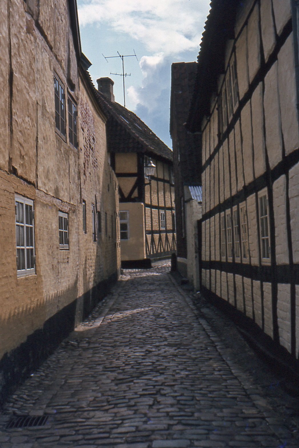 Bij heel oude Deense gebouwen zijn de raamkozijnen in één vlak geplaatst met de buitenkant van de muren. Zoals dit hier, in Ribe: (géén raad plaatje)