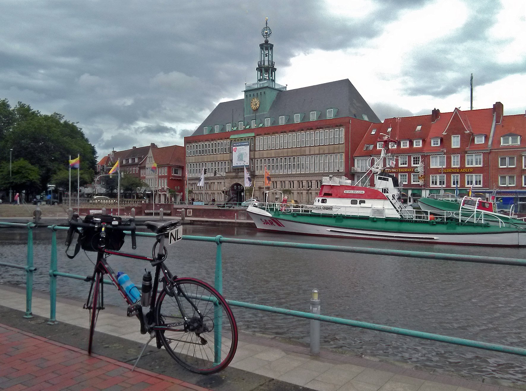 Hier mijn Focus-fiets voor het Rathaus in Emden op 7 juli 2020. Ik moest bij Obi een nieuwe keuken-mengkraan kopen (meer dan de helft goedkoper dan in NL :wink:) en heb daarna wat rondgefietst. Het was nog corona-tijd, overal een FFP-2 mondkapje op gedaan. Centrum bekeken, heerlijke Duitse broden gekocht, hier en daar foto's gemaakt tot in Larrelt aan toe, maar toen barstte er een wolkbreuk los. Hop, mijn fiets in de auto gegooid en terug naar huis gereden.