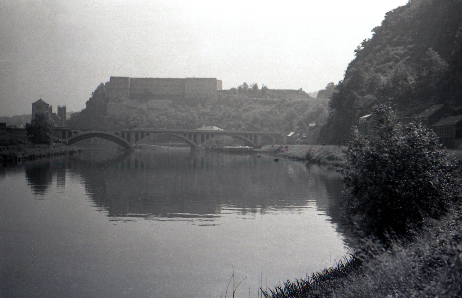 Alleen omdat die brug erg lijkt op de spoorbrug van Huy, daarom zocht ik binnen de Ardennen. Die spoorbrug heeft mijn vader in 1951 gefotografeerd. De linker boog is behoorlijk beschadigd door de oorlog.