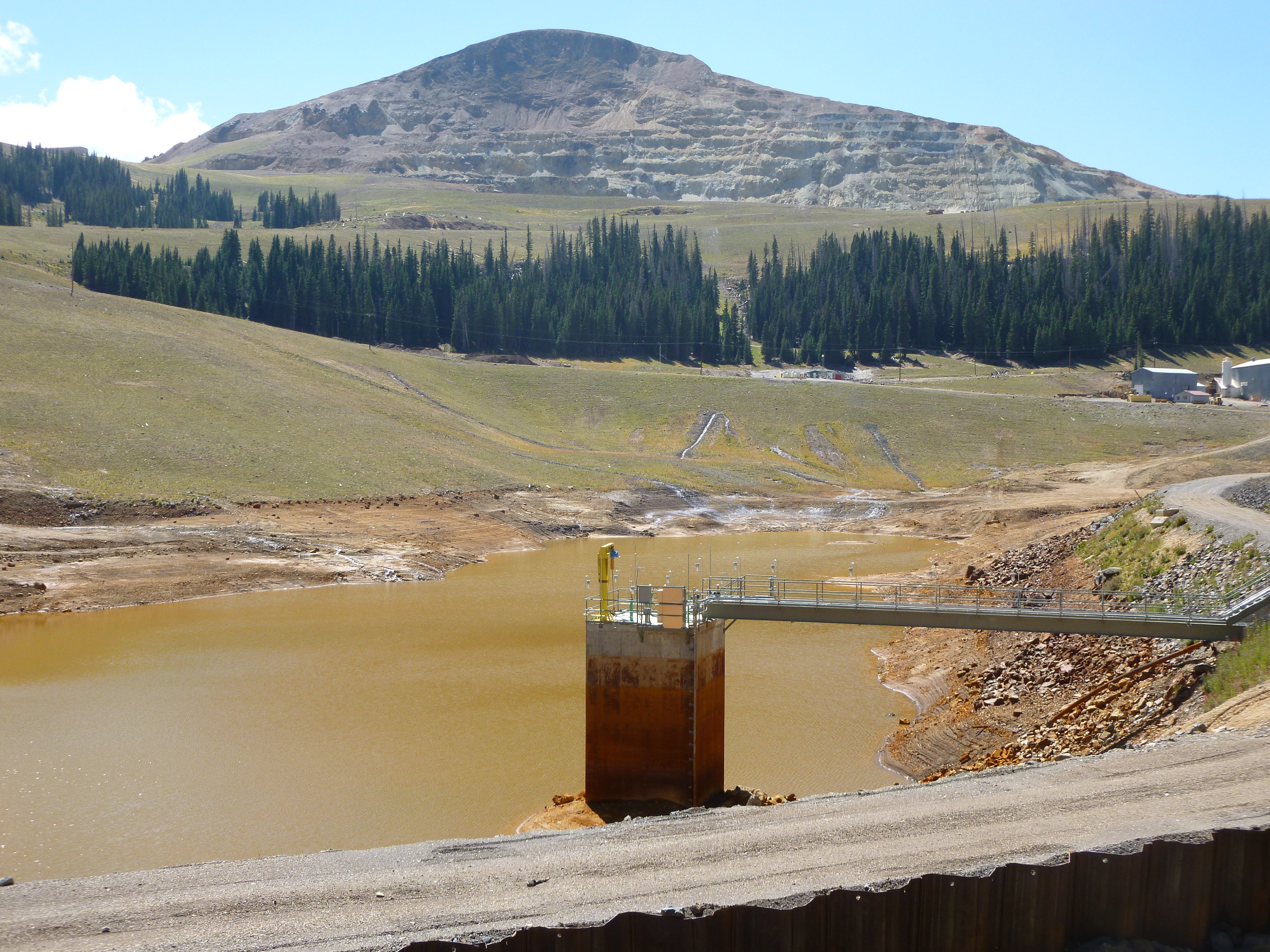 Door die dumptruck denk ik meer aan een groeve met een bodempje water, maar aangezien vrijwel elke groeve een meer heeft schiet het niet op want (gok) in het droge westen van de USA zijn net als overal talloze groeves (USA quarry lake). Wat ik niet weet is hoe het ding op de voorgrond heet. Meestal heten torens die in stuwmeren staan intake towers, maar daar is deze zo te zien duidelijk niet voor bedoeld.