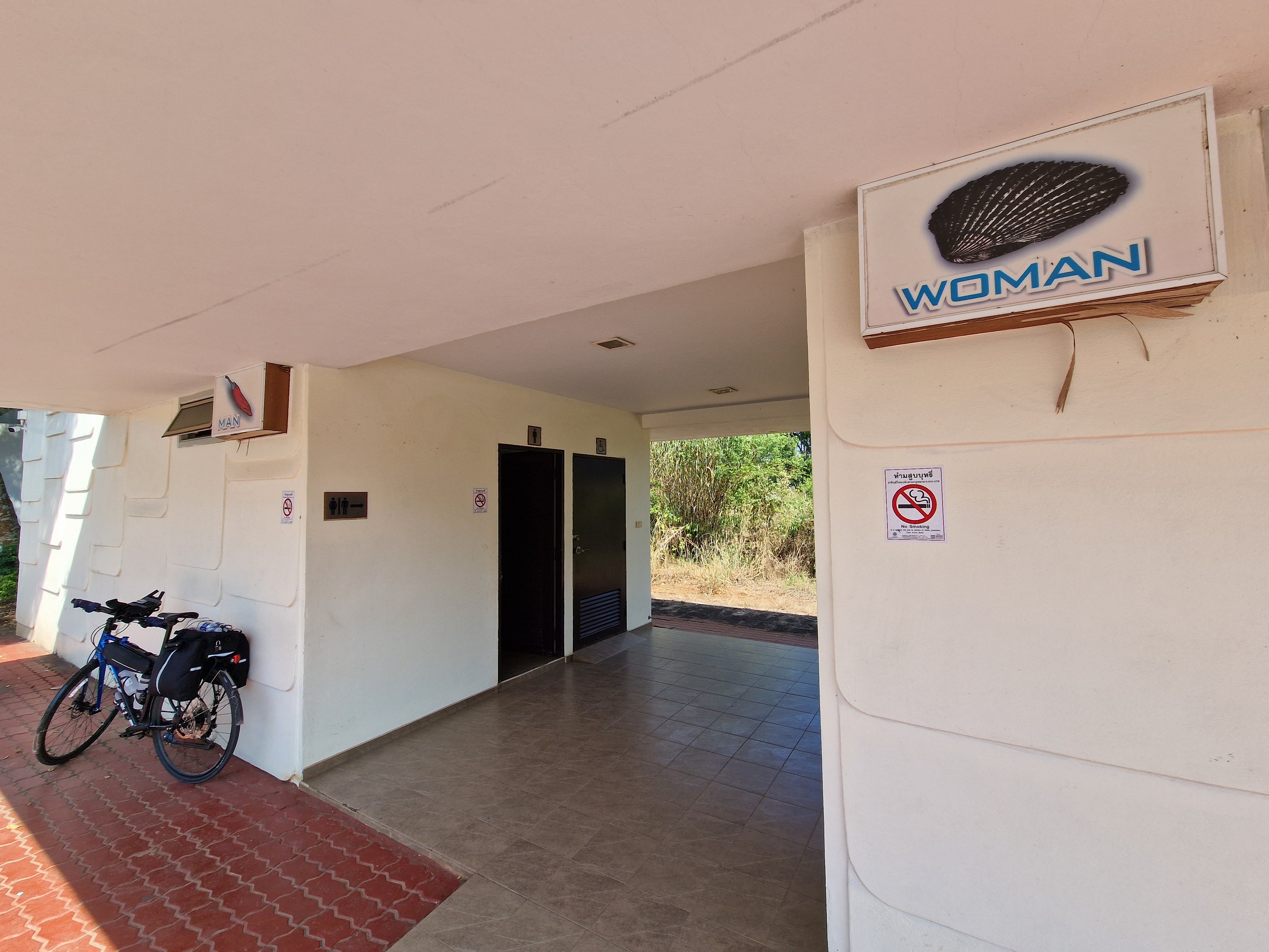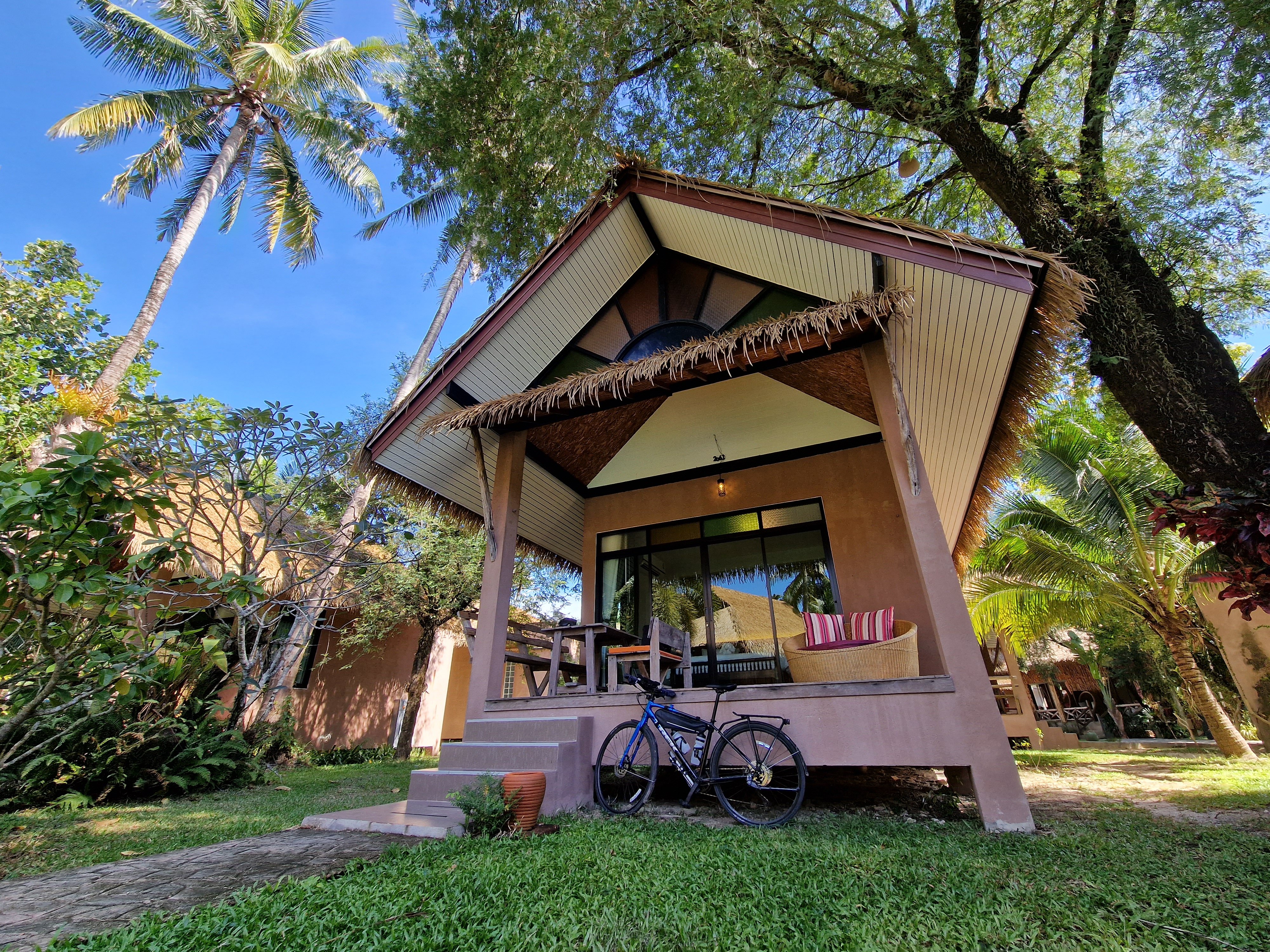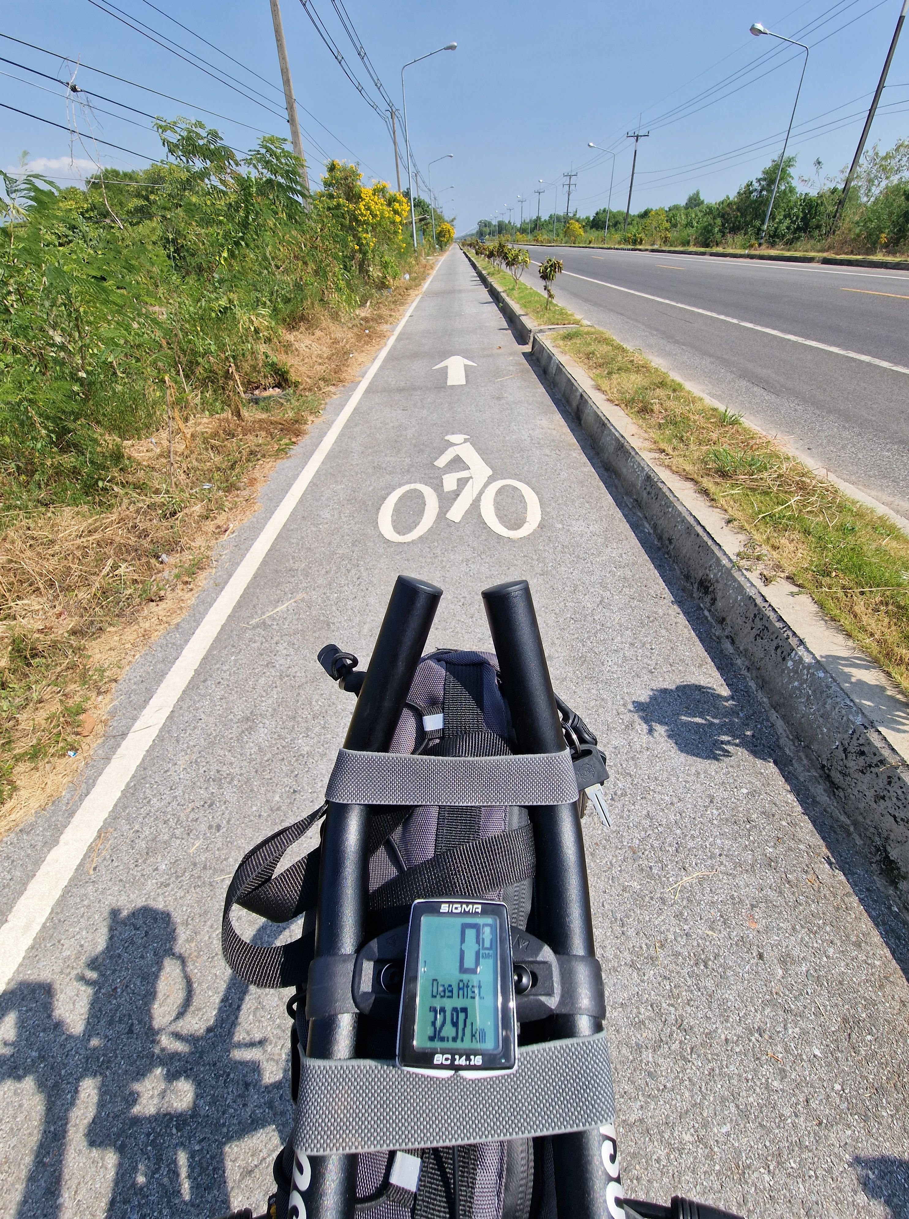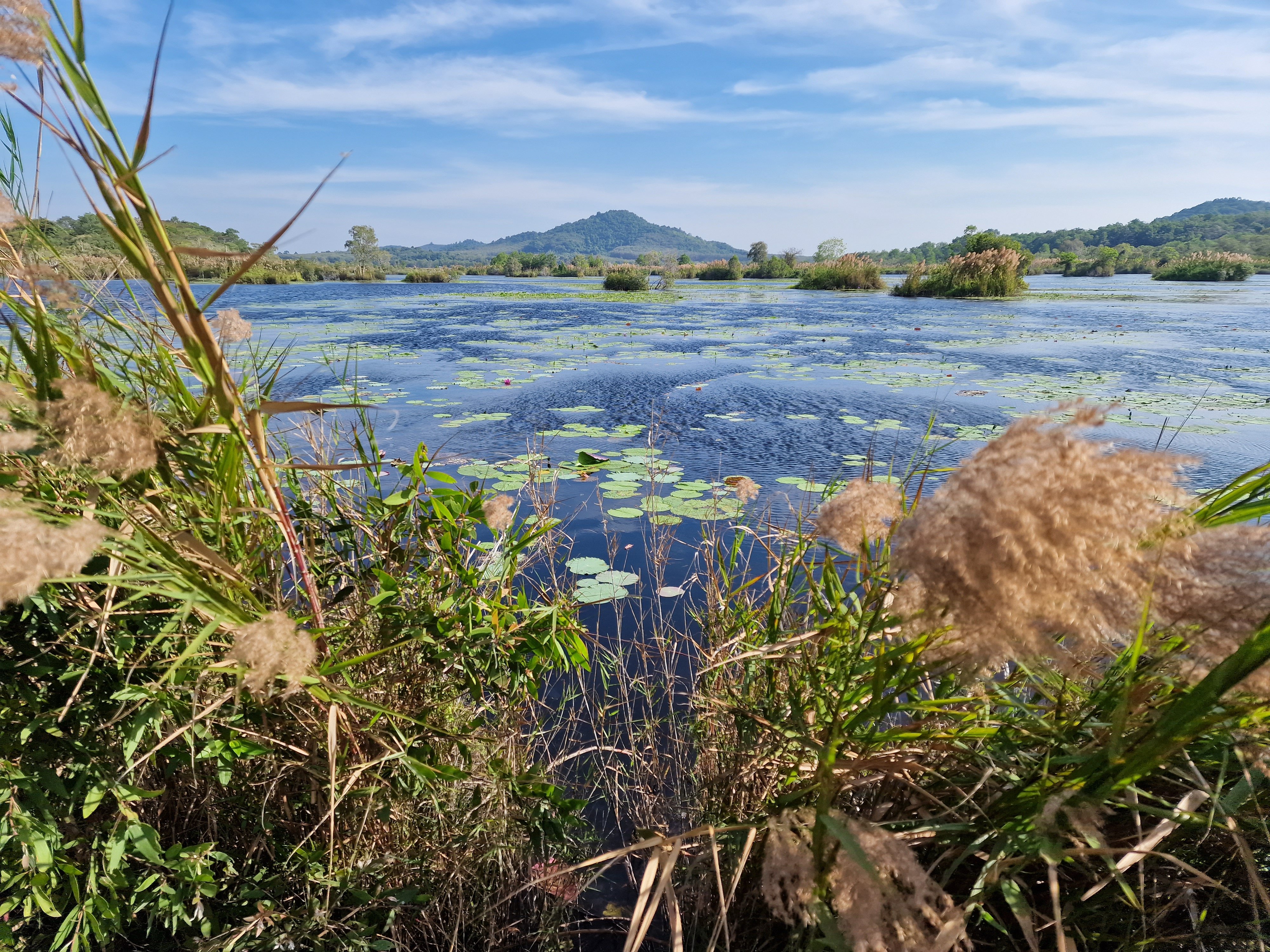 De tuin bestaat uit een aantal moeraseilanden die verbonden zijn met houten brugjes. Het landschap is niet uitzonderlijk spectaculair, maar het is heel aangenaam vertoeven in dit stukje natuur. Het is een mooi rustpunt tussen het Thaise verkeer van de vorige dagen. De brugjes zijn ook een dingetje: nog geen meter breed, geen borstwering en enkele 10-tallen meters lang. Op zich geen punt om er met beladen fiets over te rijden, maar ik behoed me opzij te kijken want ik wil het ondiepe water niet inrijden. Op het tweede brugje neemt een fotograaf huwelijksfoto’s van een mooi uitgedost jong stel. Met wat onhandig gesukkel en een verontschuldigend lachje wring ik me voorbij het koppeltje. Het laatste eiland laat ik voor wat het is want het pad ernaartoe staat onder water en ik kan niet inschatten hoe diep het precies is en hoe dik de onderliggende slijklaag is. Safety first – en het is ook nog wat vroeg om mijn 5-dagen oude fiets erdoor heen te jagen.