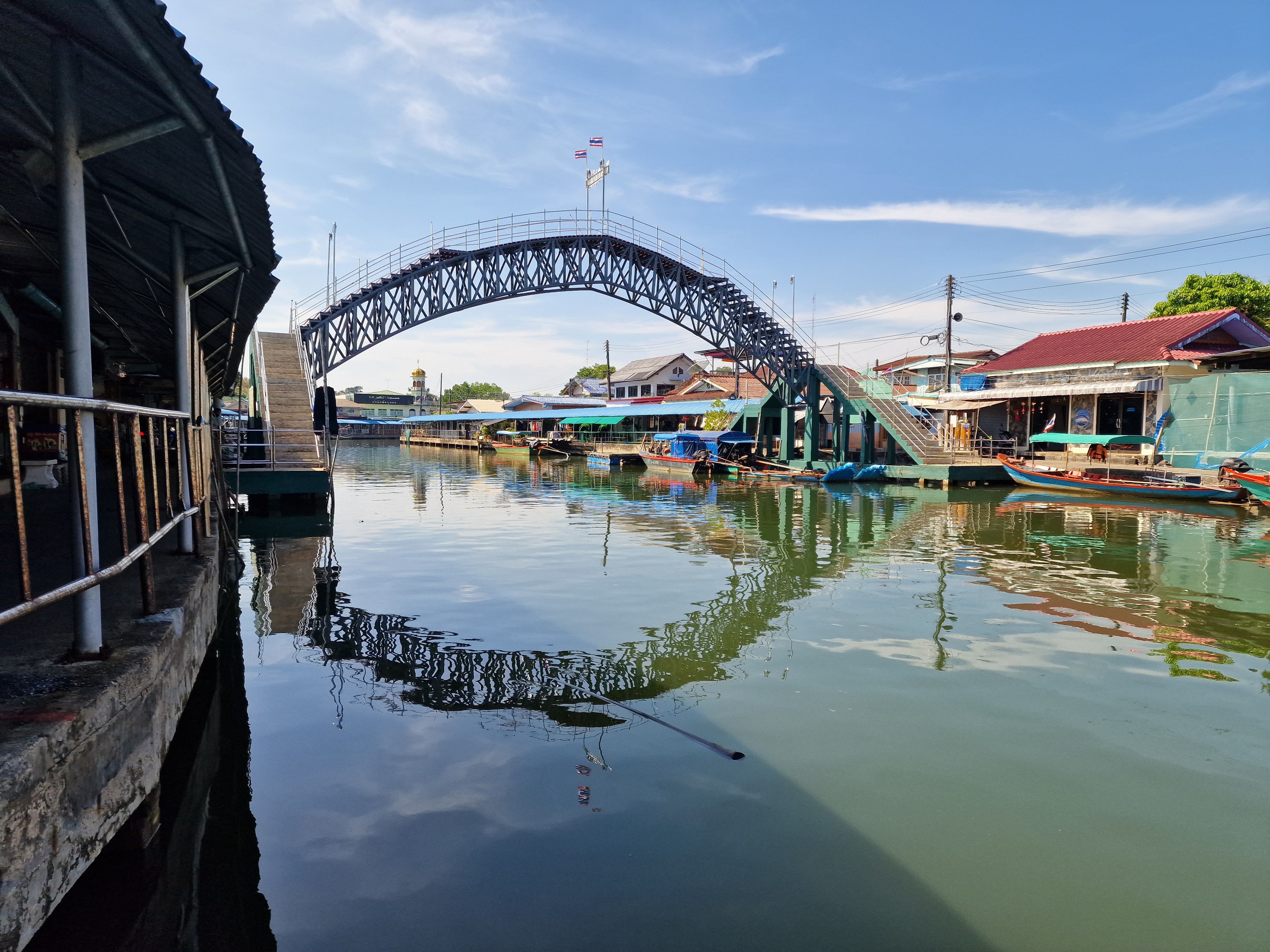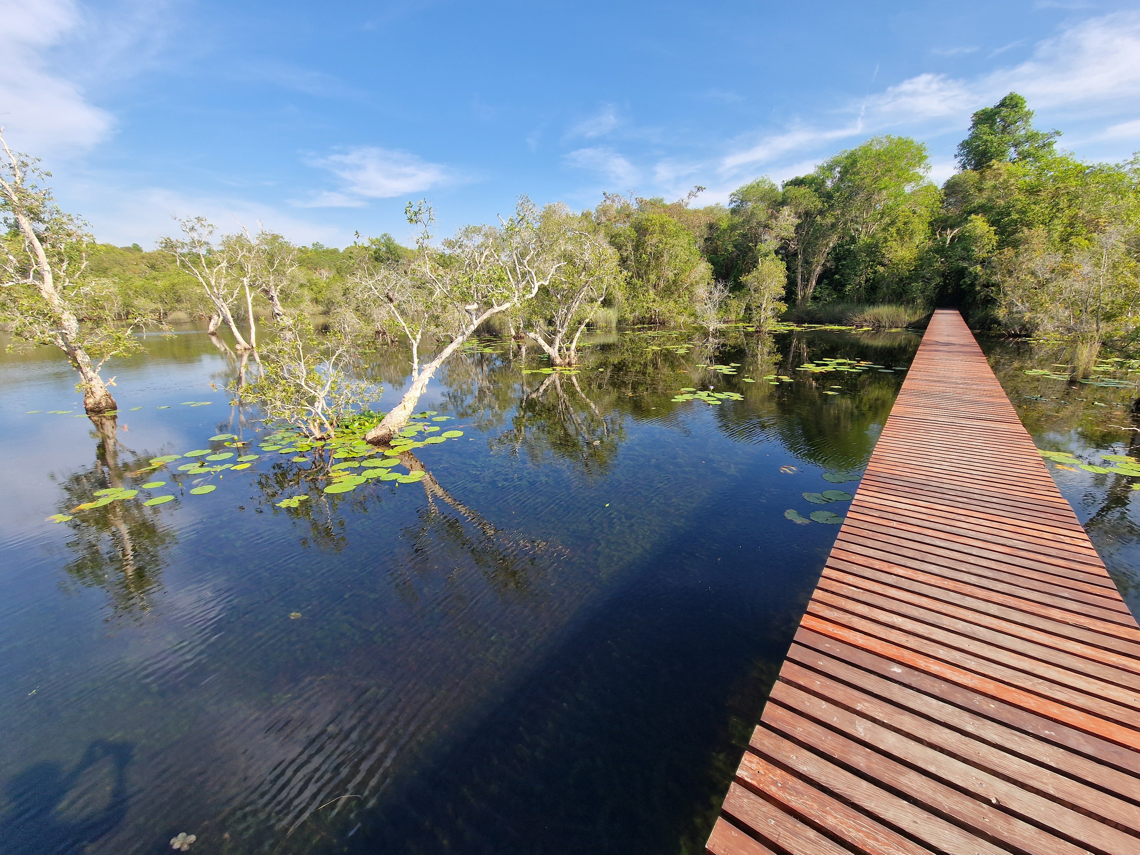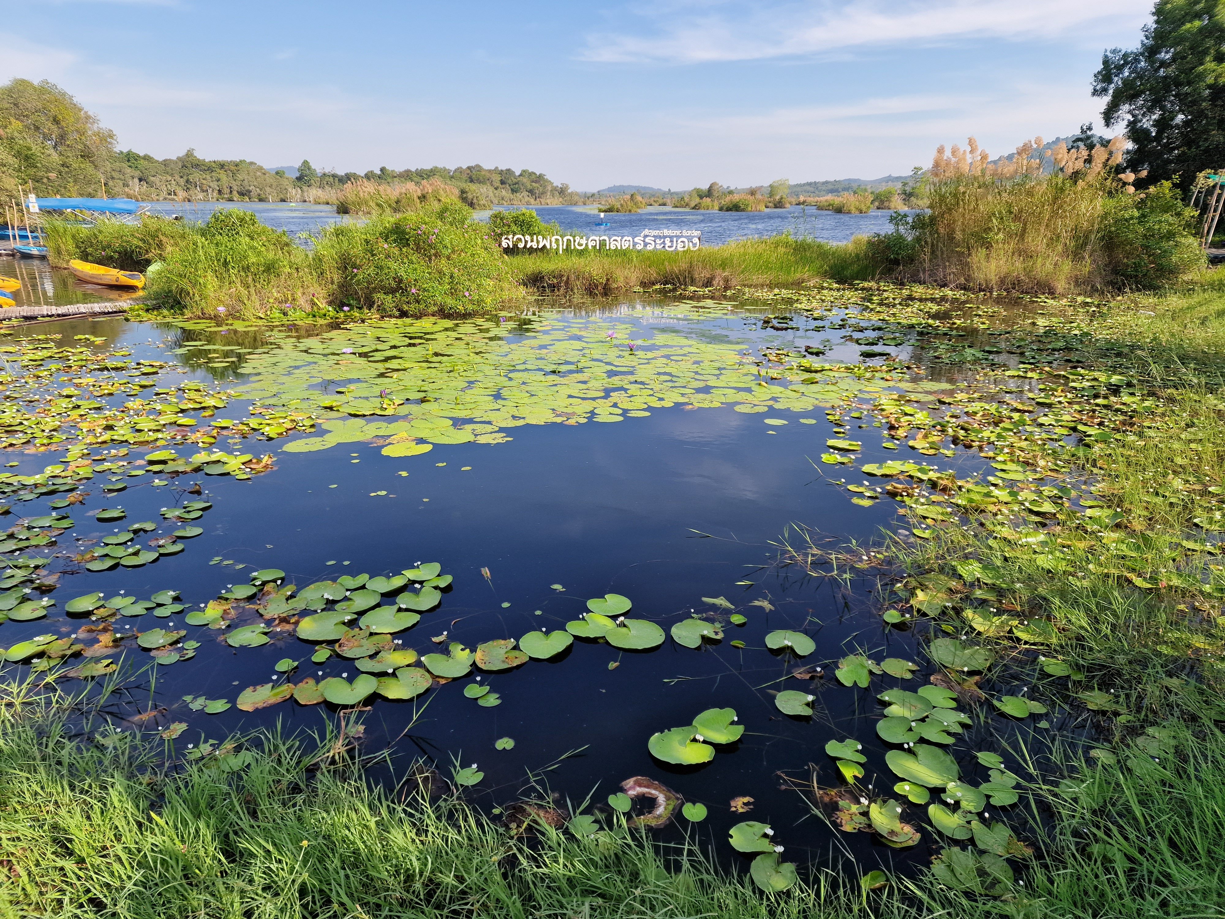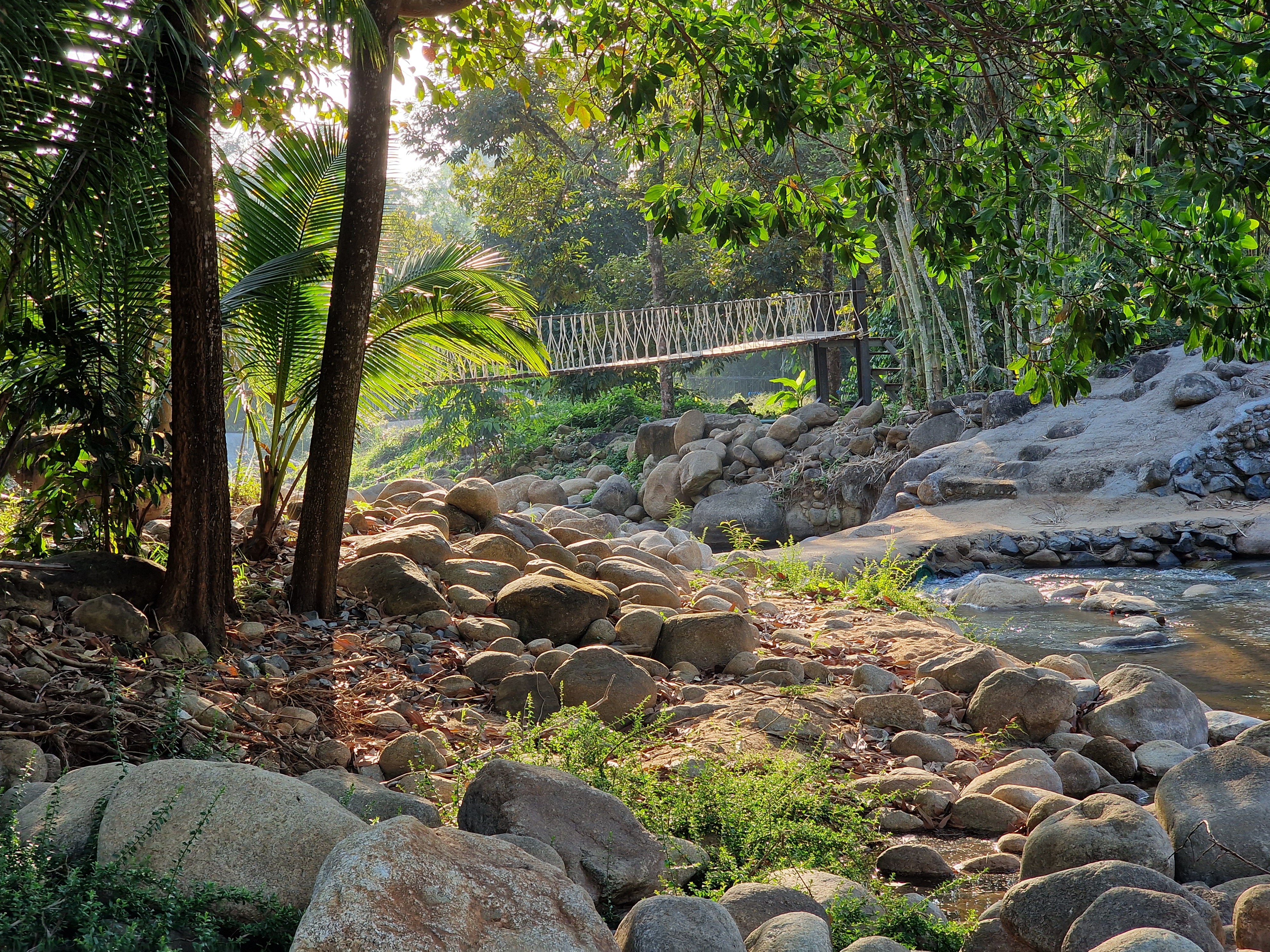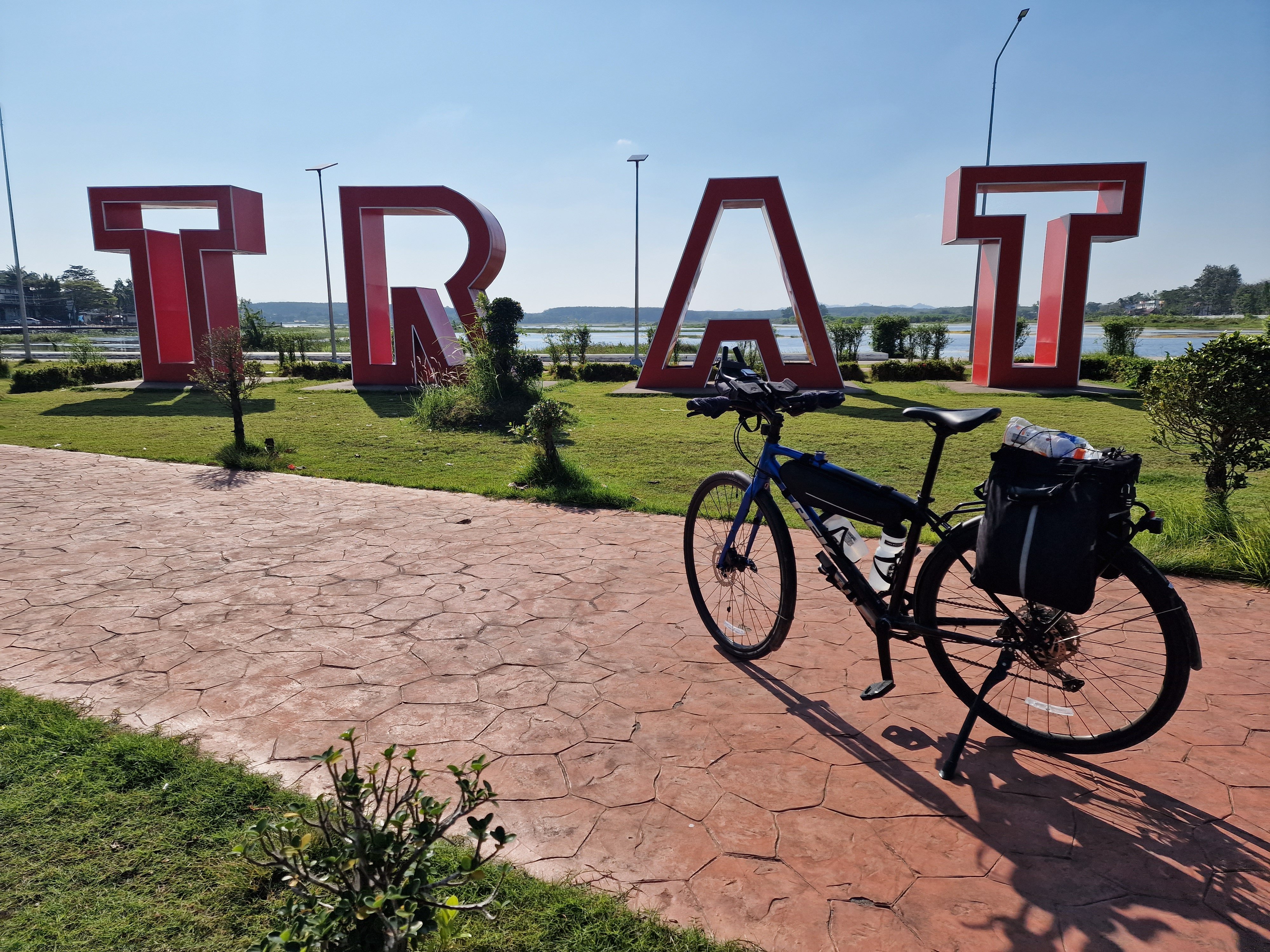 De tuin bestaat uit een aantal moeraseilanden die verbonden zijn met houten brugjes. Het landschap is niet uitzonderlijk spectaculair, maar het is heel aangenaam vertoeven in dit stukje natuur. Het is een mooi rustpunt tussen het Thaise verkeer van de vorige dagen. De brugjes zijn ook een dingetje: nog geen meter breed, geen borstwering en enkele 10-tallen meters lang. Op zich geen punt om er met beladen fiets over te rijden, maar ik behoed me opzij te kijken want ik wil het ondiepe water niet inrijden. Op het tweede brugje neemt een fotograaf huwelijksfoto’s van een mooi uitgedost jong stel. Met wat onhandig gesukkel en een verontschuldigend lachje wring ik me voorbij het koppeltje. Het laatste eiland laat ik voor wat het is want het pad ernaartoe staat onder water en ik kan niet inschatten hoe diep het precies is en hoe dik de onderliggende slijklaag is. Safety first – en het is ook nog wat vroeg om mijn 5-dagen oude fiets erdoor heen te jagen.