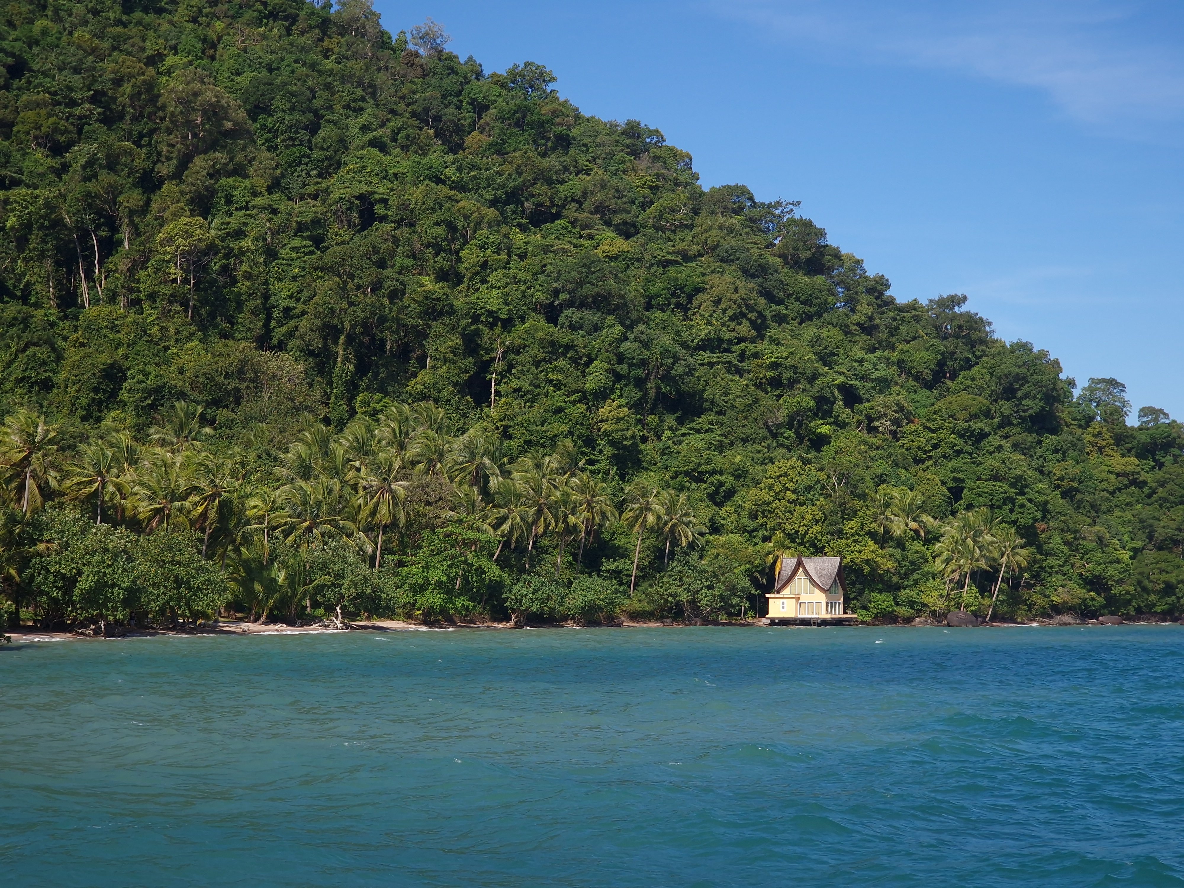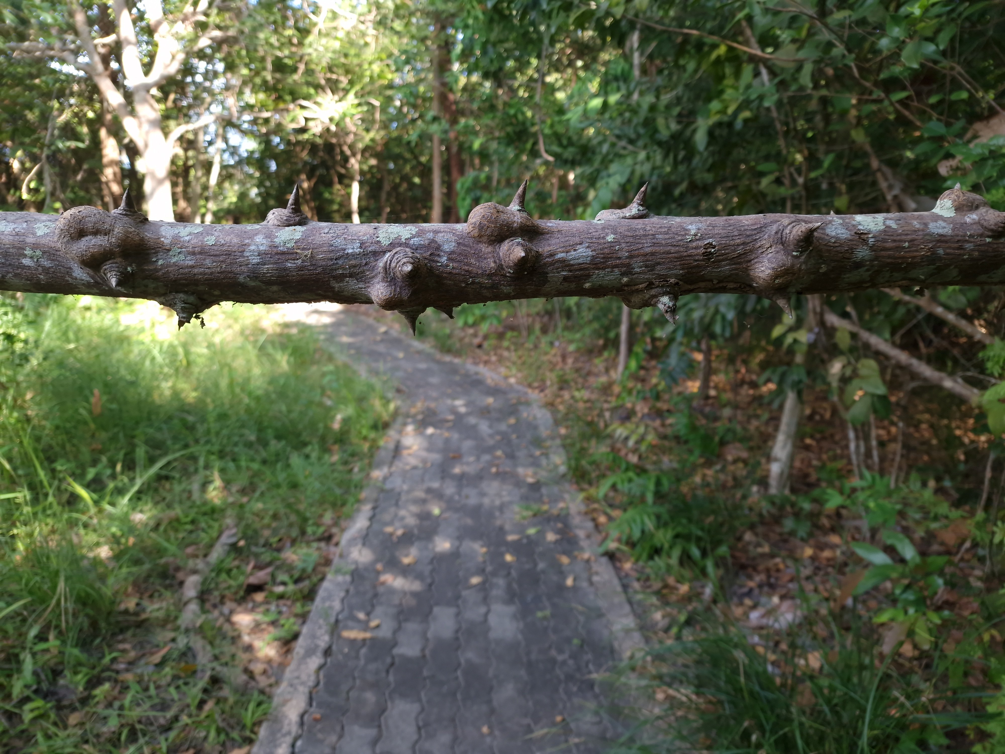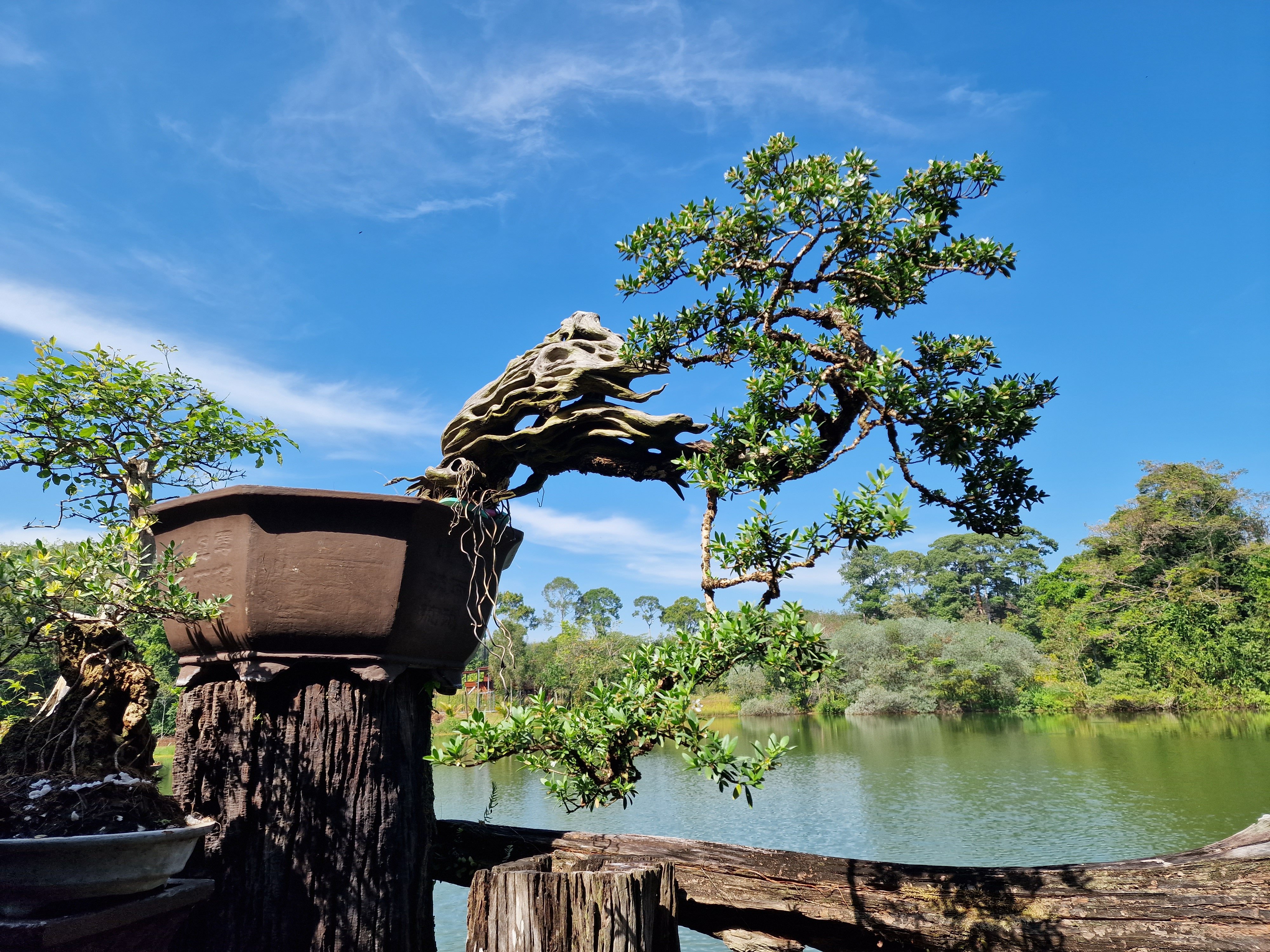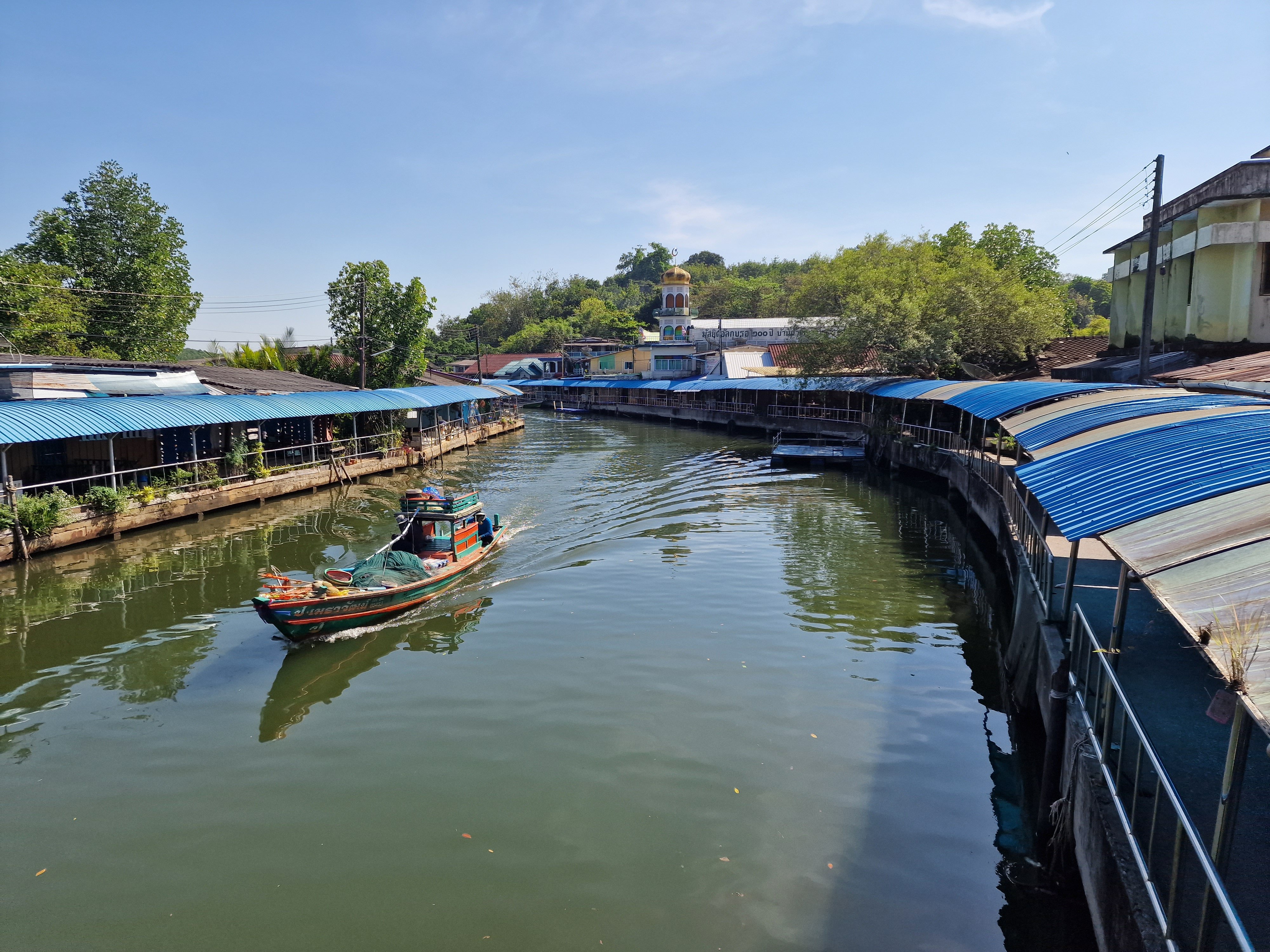 De tuin bestaat uit een aantal moeraseilanden die verbonden zijn met houten brugjes. Het landschap is niet uitzonderlijk spectaculair, maar het is heel aangenaam vertoeven in dit stukje natuur. Het is een mooi rustpunt tussen het Thaise verkeer van de vorige dagen. De brugjes zijn ook een dingetje: nog geen meter breed, geen borstwering en enkele 10-tallen meters lang. Op zich geen punt om er met beladen fiets over te rijden, maar ik behoed me opzij te kijken want ik wil het ondiepe water niet inrijden. Op het tweede brugje neemt een fotograaf huwelijksfoto’s van een mooi uitgedost jong stel. Met wat onhandig gesukkel en een verontschuldigend lachje wring ik me voorbij het koppeltje. Het laatste eiland laat ik voor wat het is want het pad ernaartoe staat onder water en ik kan niet inschatten hoe diep het precies is en hoe dik de onderliggende slijklaag is. Safety first – en het is ook nog wat vroeg om mijn 5-dagen oude fiets erdoor heen te jagen.