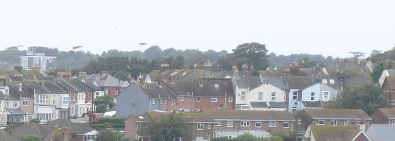 ..Als deze foto richting ZW is genomen, dan loopt de kust ongeveer oost-west. Ik heb Folkestone, Hastings en Brighton geprobeerd (zelf daar gefietst), maar die kerktoren is daar niet te zien. Bornemouth misschien? De Engelse zuidkust is zo lang....