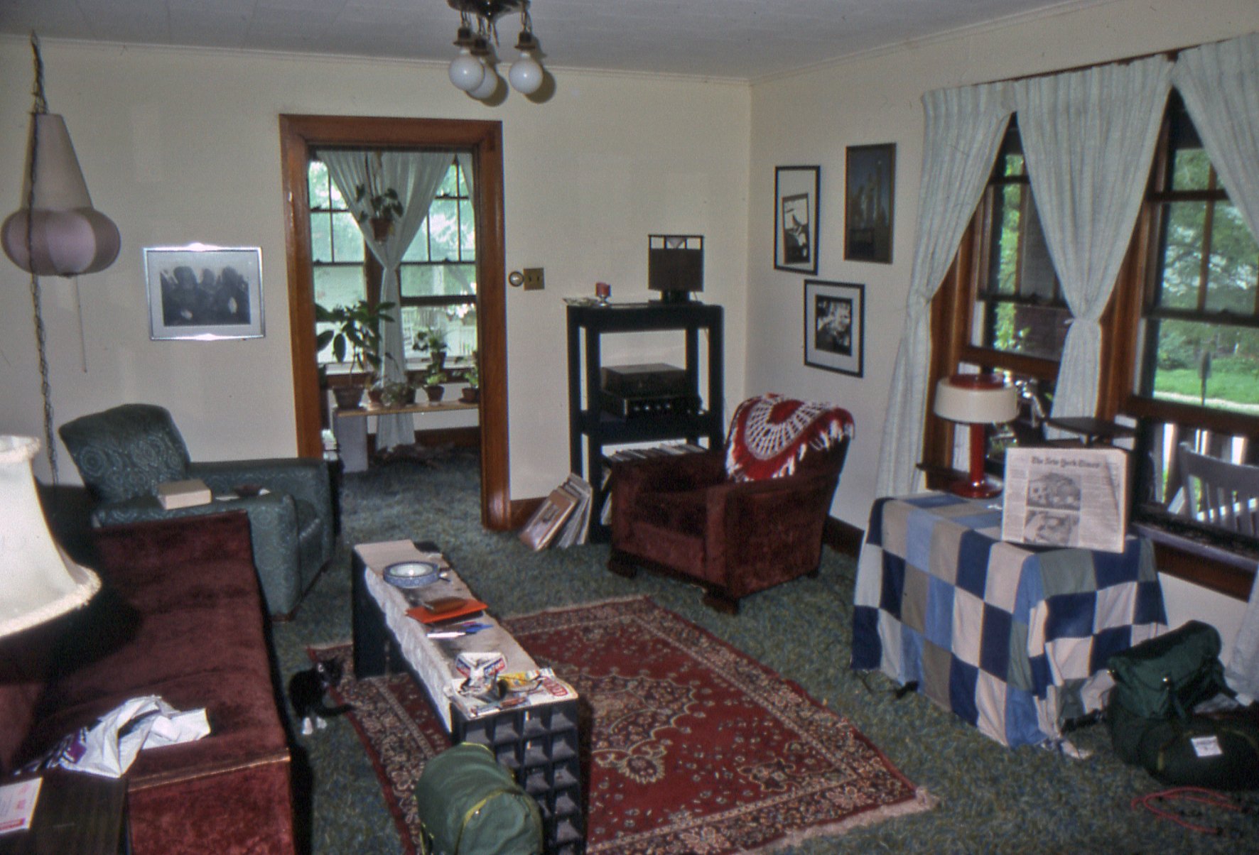 Op de foto zie je haar woonkamer, op de vloer staan mijn nog nieuwe Karrimor-fietstassen. En een jong katje. Let eens heel goed op de krant rechts. Foto's van een doorzeefde Hondenkop-trein bij De Punt! Ook al wereldnieuws geworden.