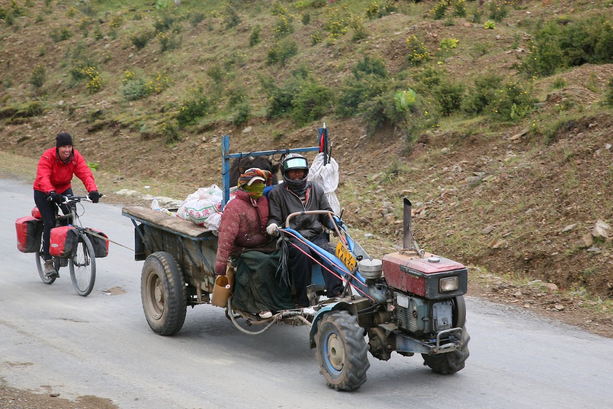 Eerst een ronkende motor, dan een stel lachende Chinezen, dan een koe op een kar, een stuk touw en dan Lisette die mij stralend voorbij stuift.