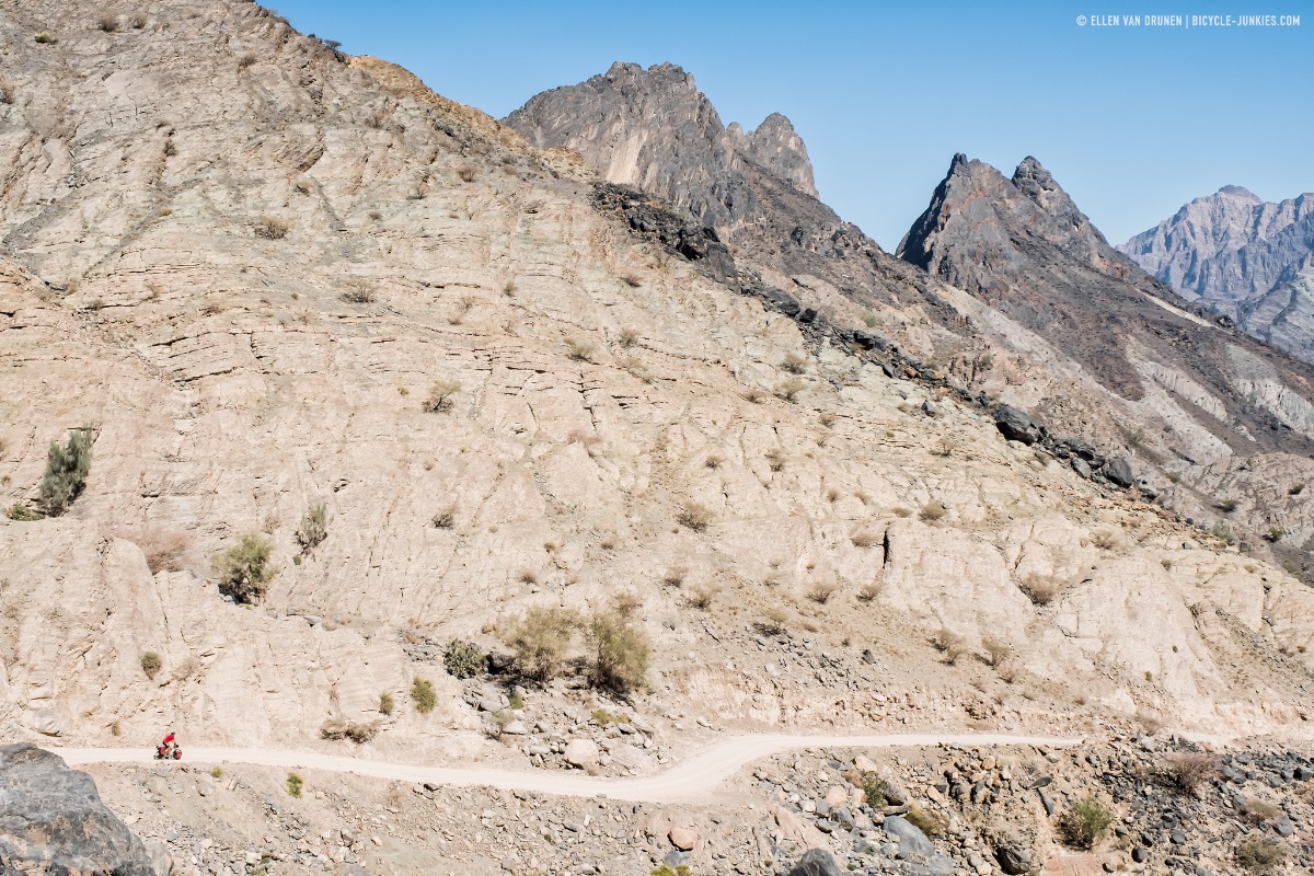 De bestemming waar we al een tijdje naar uitkijken, de klim naar Jebel Shams; Oman’s hoogste berg. Niet ver van Nizwa, maar wel een pittige klim, waarvan de laatste 9 kilometer onverhard. Nog 24 kilometer te gaan en wat een makkie lijkt, daar doen we uiteindelijk de hele dag over. De eerste 5-6 kilometer gaan tergend langzaam, omdat we meer met de fiets aan de hand lopen dan dat we daadwerkelijk fietsen. Het is gruwelijk steil, wie verzint dit! En dat met die hitte, het is afzien, maar het landschap om ons heen wordt steeds mooier en ruiger. De aarde splitst zich hier en we kijken in de weergaloze diepte van de canyon, terwijl de zon langzaam achter de bergen zakt.