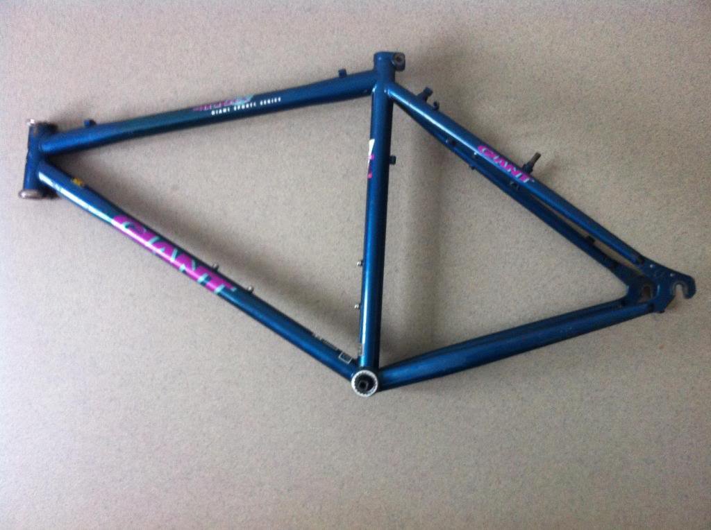 Ik heb de basis voor de toerfiets staan, dat is het frame en voorvork van een Giant Sierra uit 87 heb het frame gestraald en deze word na het primen matzwart gespoten. Mijn doel is om zo kosten bewust mogelijk toch een knappe fiets in elkaar te zetten.