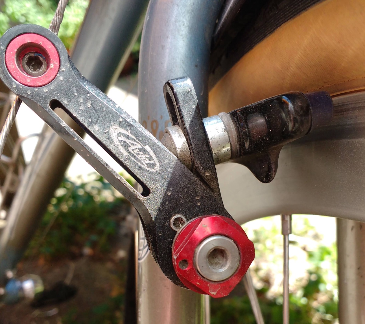 het rekje moet worden bevestigd op de twee cantilever nokken en een derde in het midden waar spatbord bevestiging door voorvork gaat. Nu zitten er echter Avid Shorty Ultimate cantilever remmen op (waar ik toch al niet zo tevreden over was, maar dat kan afstelling zijn), en deze hebben aan de voorkant geen ruimte om dat rekje tussen de schroeven in te prutsen