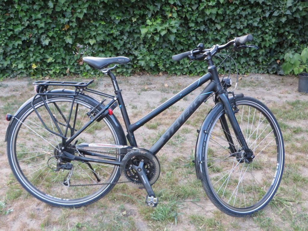 ter info: fiets is maat 46, het zadel staat op goede hoogte. De fiets zal vermoedelijk vooral gebruikt worden voor dagtochten in België en mogelijks korte fietsvakanties in buurlanden. Hij is vrij licht, dus kan al wat makkelijker mee in de trein.