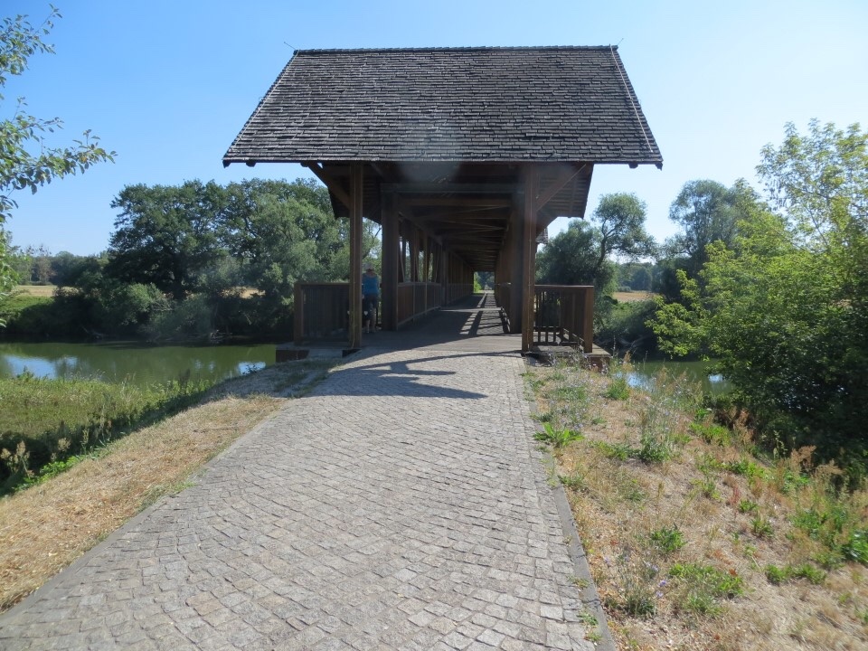 Je mag de fiets aan de hand meenemen. Brug is wel erg smal maar het lukt nét (al zullen mensen wel vreemd opkijken). Fietsend is wel een uitdaging vanwege de smalte en de helling ;) en kan alleen als de brug leeg is (dus héél vroeg... kan je waarschijnlijk ook wel heel fraaie foto's maken van het mooie dal onder je.