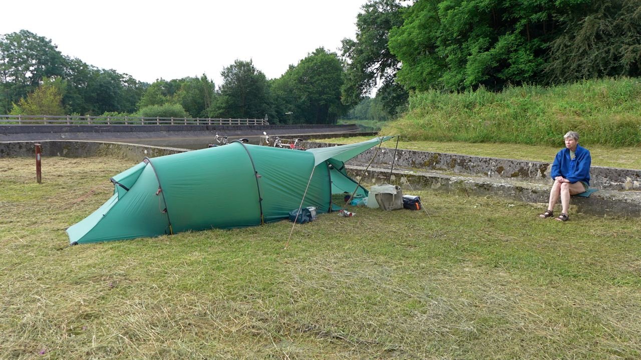 Zelf haal ik bij regen en een reële kans dat het bij aankomst ook weer zal regenen de droge binnentent er eerst uit, en pak die apart in in een lichte waterdichte zak. De natte buitentent met het vieze ondergrondzeil er aan vast gaat dan in het foedraal van de tent. Vervolgens gaat dat dan bovenop de drager. Als ik met mijn vrouw op reis ben gaat onze Nammatje 3GT dwars op de drager, deels om het gewicht zover mogelijk naar voren te hebben. Als ik alleen ben gaat een kleinere tent meestal in de lengte, al was het maar omdat je dan onderweg makkelijker bij je tassen kunt. Maar die Nammatj is daar echt te lang voor.