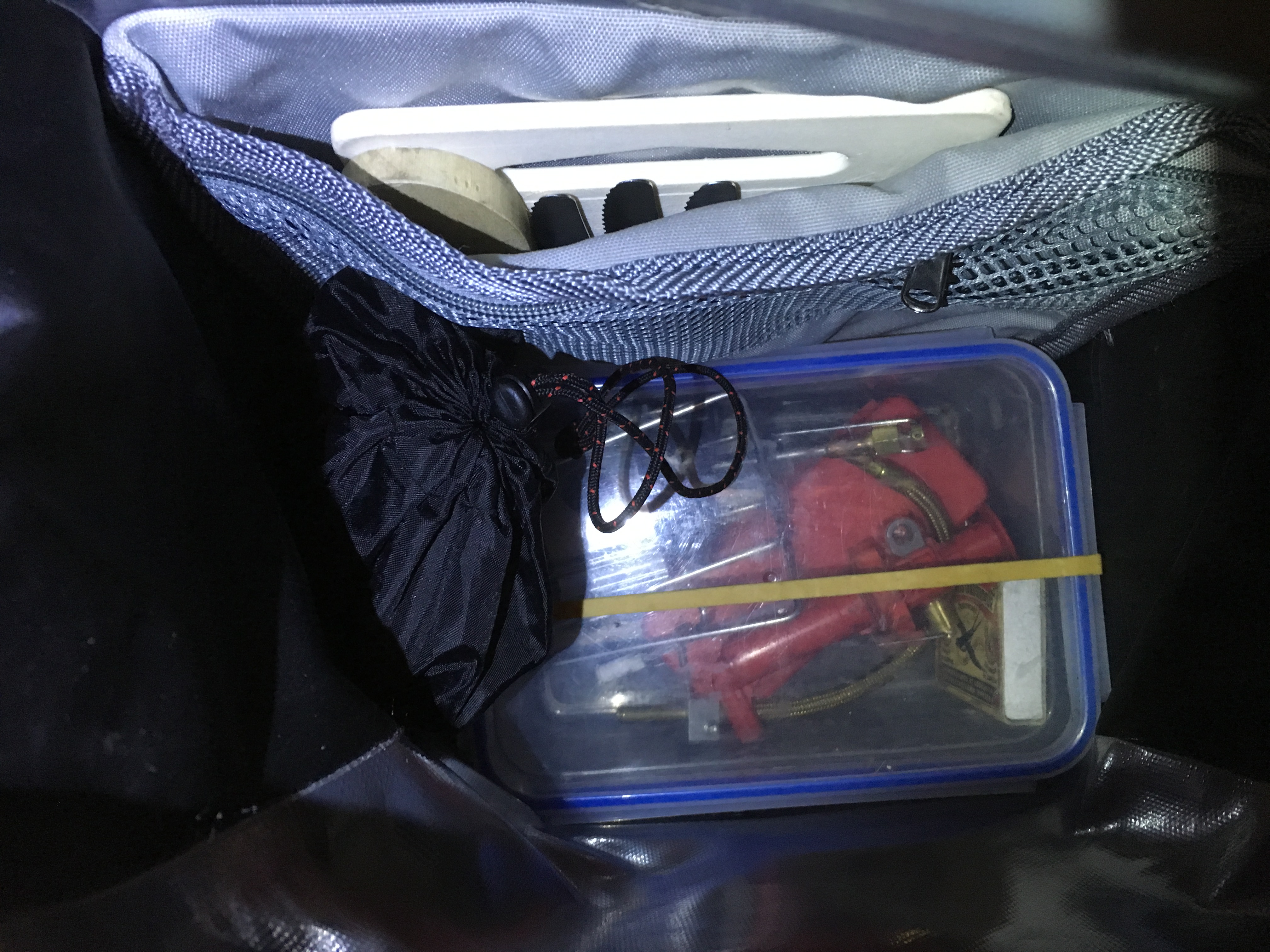 Onderin een bewaardoos van de Action (zie: https://www.action.com/nl-nl/p/excellen ... rtrommel2/, met daarin mijn MSR Dragonfly brander, pomp, onderhoudssetje, aansteker en lucifers.