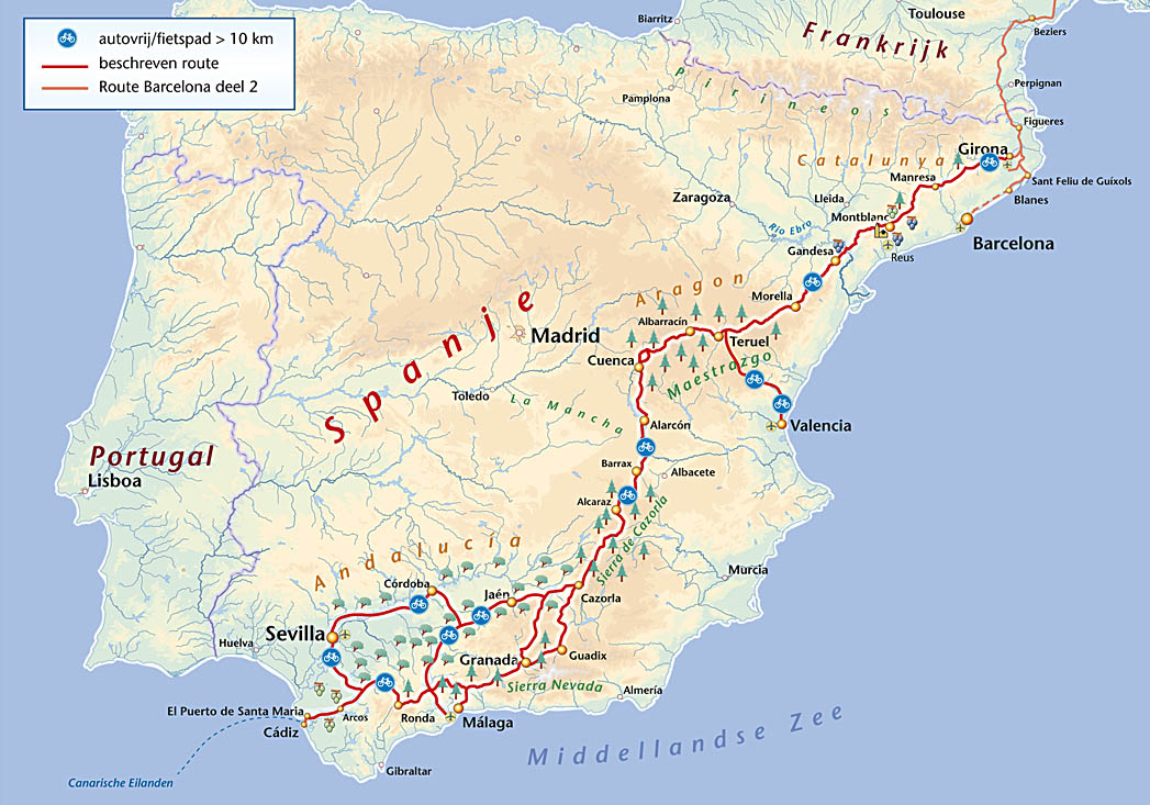 Ik heb het aflopen jaar het rondje onderin Andalusië gemaakt, vanaf Malaga met de klok mee. Vanuit Malaga ga je meteen de bergen in, dat heeft mij pijn gedaan, ik fiets het liefst eerst een paar dagen vlak om de benen sterk te krijgen. Maar het is een prachtig stuk Spanje om te fietsen. Er zit een camping vlak boven Ronda, met gigantische mieren, maar verder is het een goede plek. Ronda is de moeite waard, een goede plek voor een wandeling, en ook een kuitenbijter, zowel te voet als op de fiets.