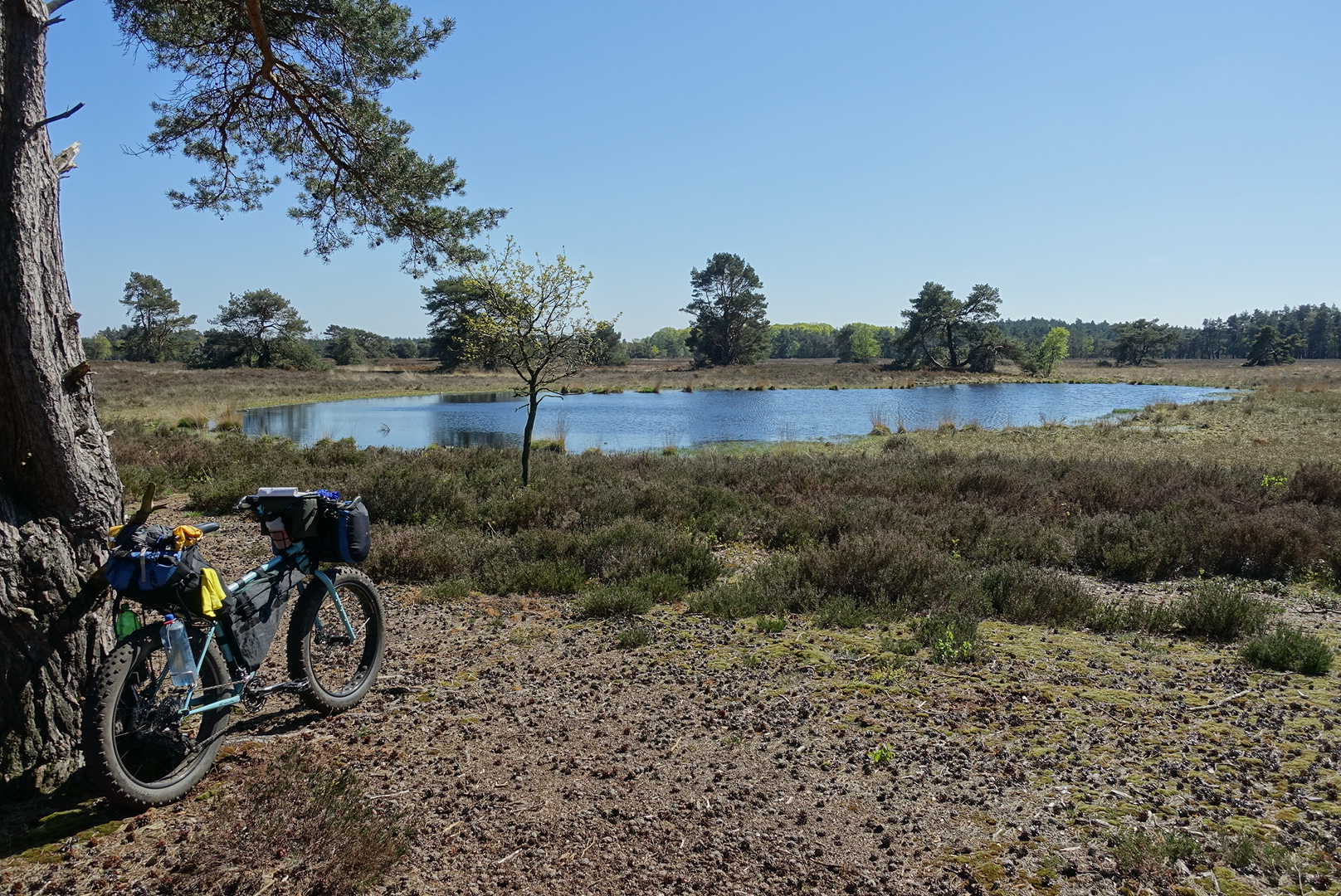 Ortlieb zadeltas met Exped pompzak, winterslaapzak, zijden slaapzakliner en donsjasje. Bovenop de zadeltas had ik nog mijn rugzakje gebonden met daarin 2 snacks voor onderweg