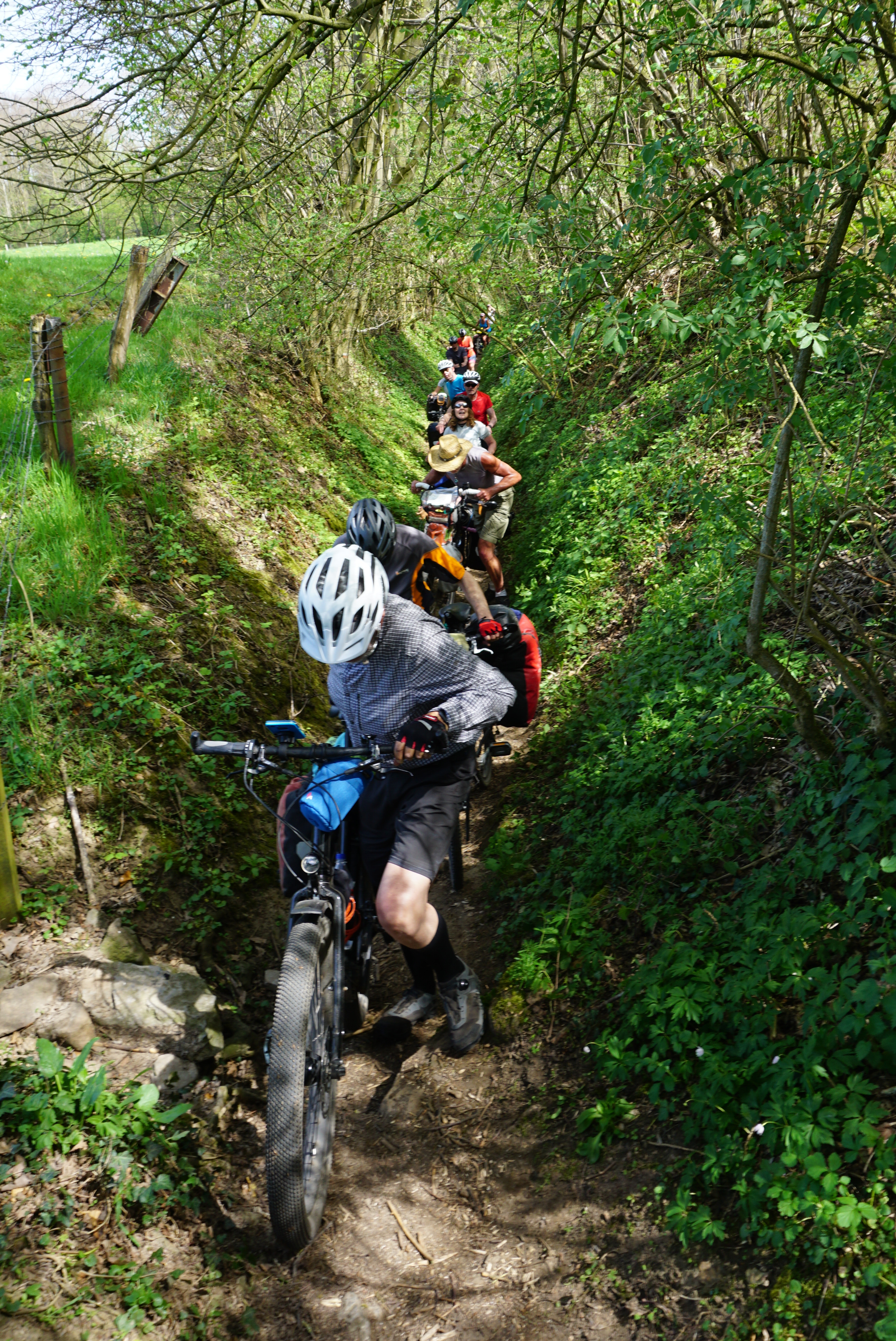 Dan volgt weer een stukje klimmen, ditmaal over een voor het mergelland zo karakteristieke holle weg, die de geschiedenis in zal gaan als het Titanium Tonpaadje. We treffen er een heuse wereldfietserfile aan.