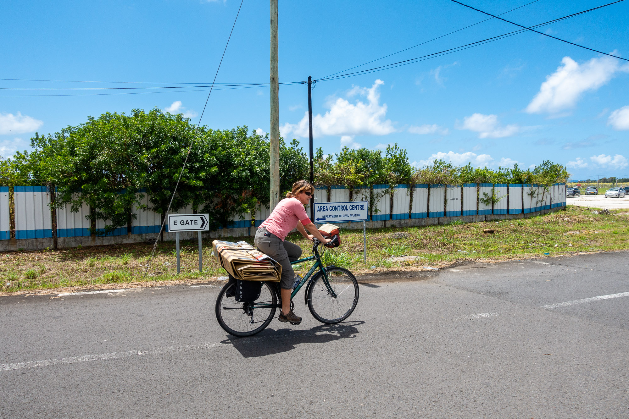 Fiets in doos in de ene hand, twee fietstassen samen in de andere hand. De rest thuislaten.