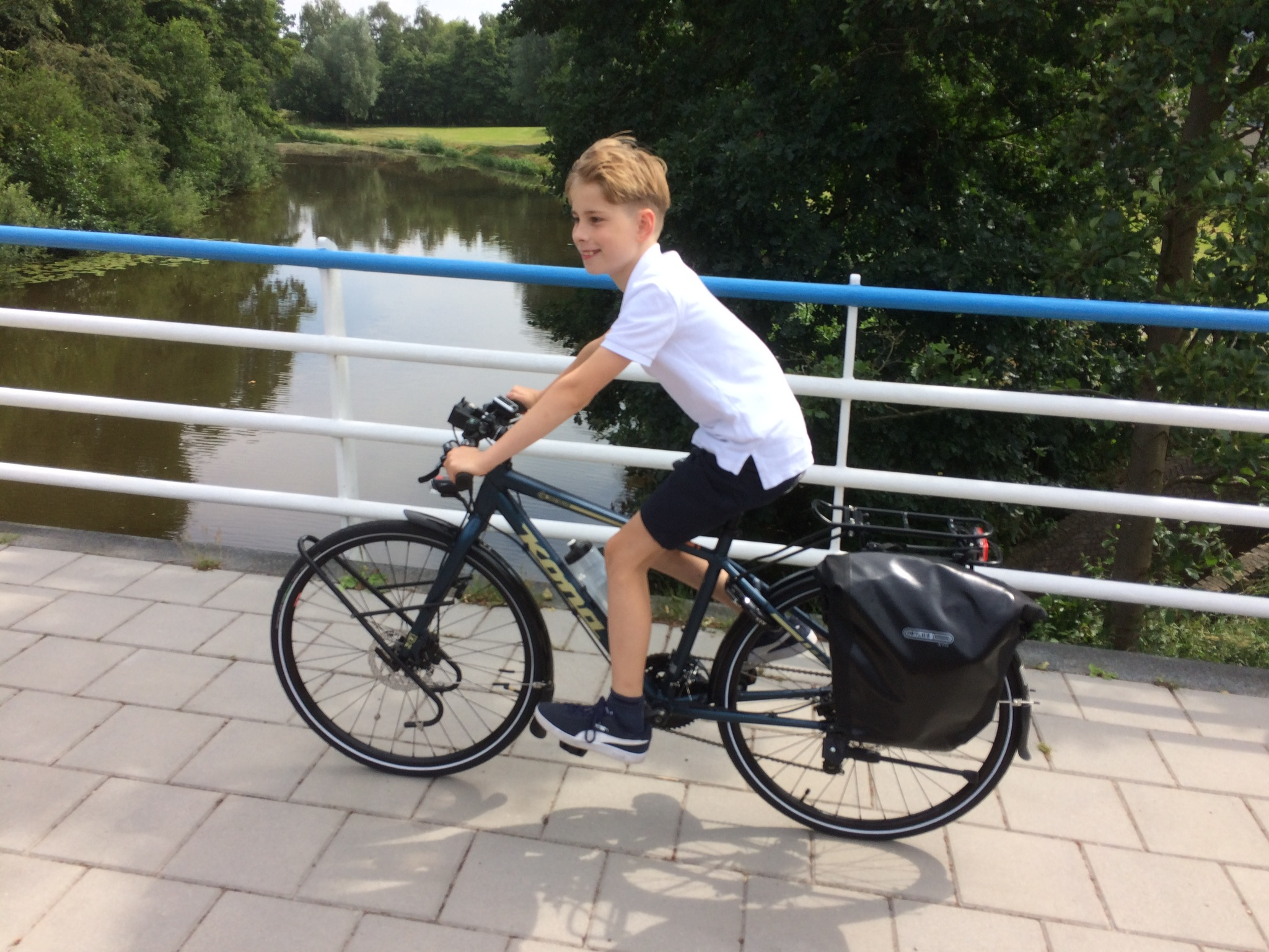 De fiets heeft bandenmaat 37-584, door Schwalbe aangeduid als 26 inch. Door de kleinere bandenmaat en wellicht ook de plek van de bevestigingspunten op de vork staan de horizontale steunen wat minder horizontaal. Als de tassen er eenmaal op zitten zie je het wel, maar is het acceptabel (vind ik).