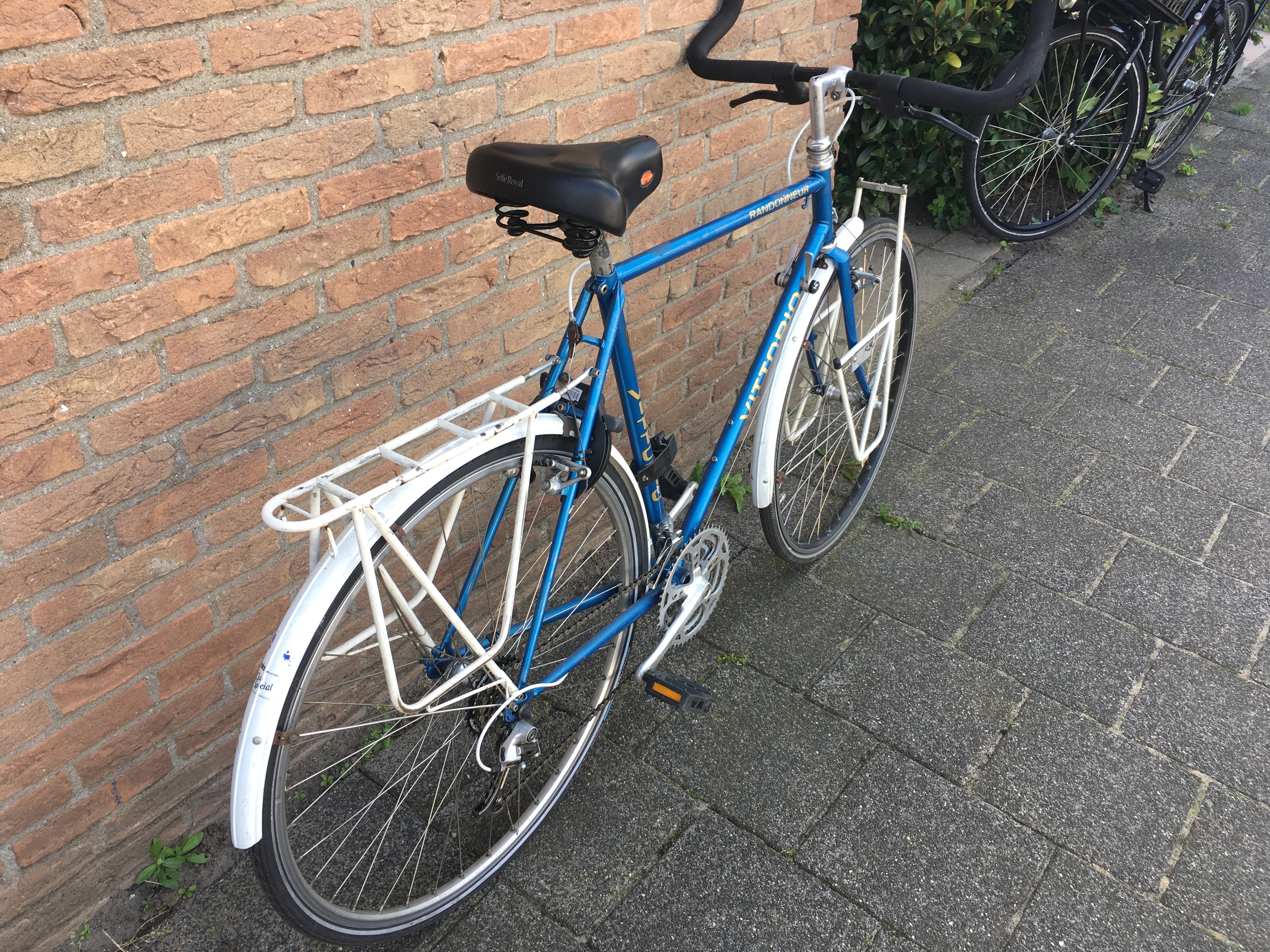 Een Vittorio randonneur uit de 80er jaren, gekocht van een gestopte wereldfietser, met de intentie om er boodschappen mee te doen, maar door te veel fietsen verzameld toch beschikbaar.