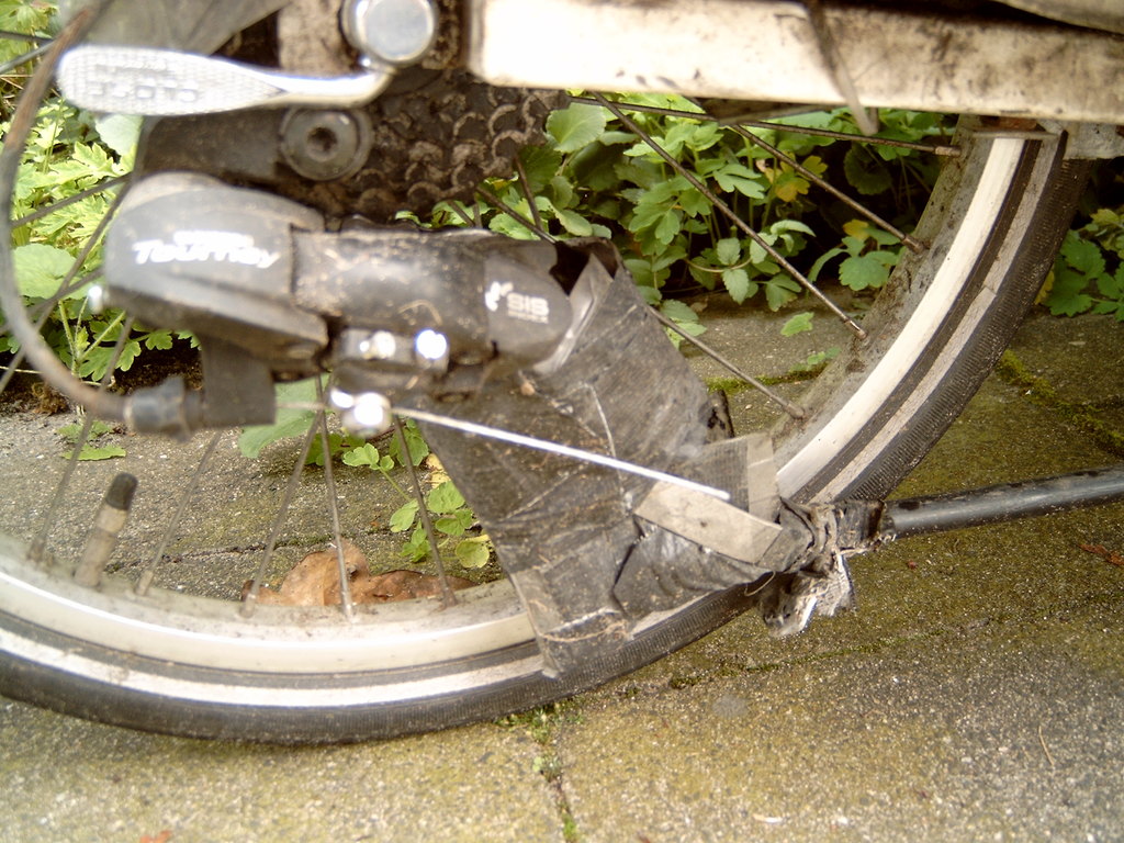 Is dat een flevo-alleweder? Die had ik vroeger ook en daarvan had ik retour-kettingbuis vastgezet aan de achterderailleur zodat het gedeelte bij goed afgesloten was, wat wel nuttig was vlak bij het 20" achterwieltje.