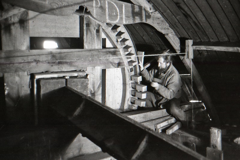 Hier nog op de molen De Jonge Hendrik; ik verving in 1993 de kammen (tanden) van het bovenwiel op de wiekenas. De nog vierkante koppen eerst 'op steek aftekenen' en dan verder afwerken. De molenmaker laten komen is altijd een kostbare aangelegenheid, want zo'n kam kostte nieuw wel 100 gulden per stuk!