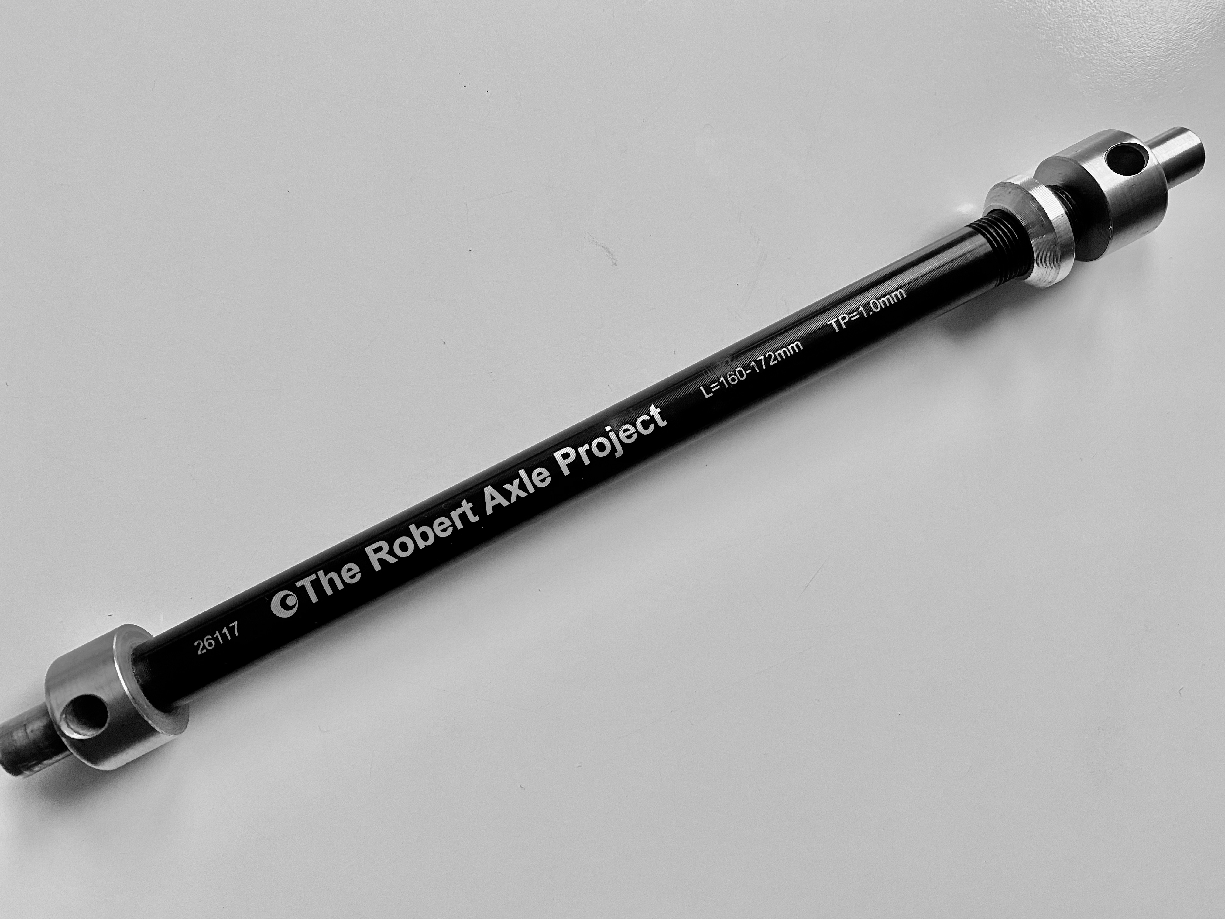 Een The Robert Axle Project 12mm Thru Axle voor BOB Trailers - 1.0mm Thread Pitch gemaakt van geanodiseerd 7075 aluminium (M12x 1,0).