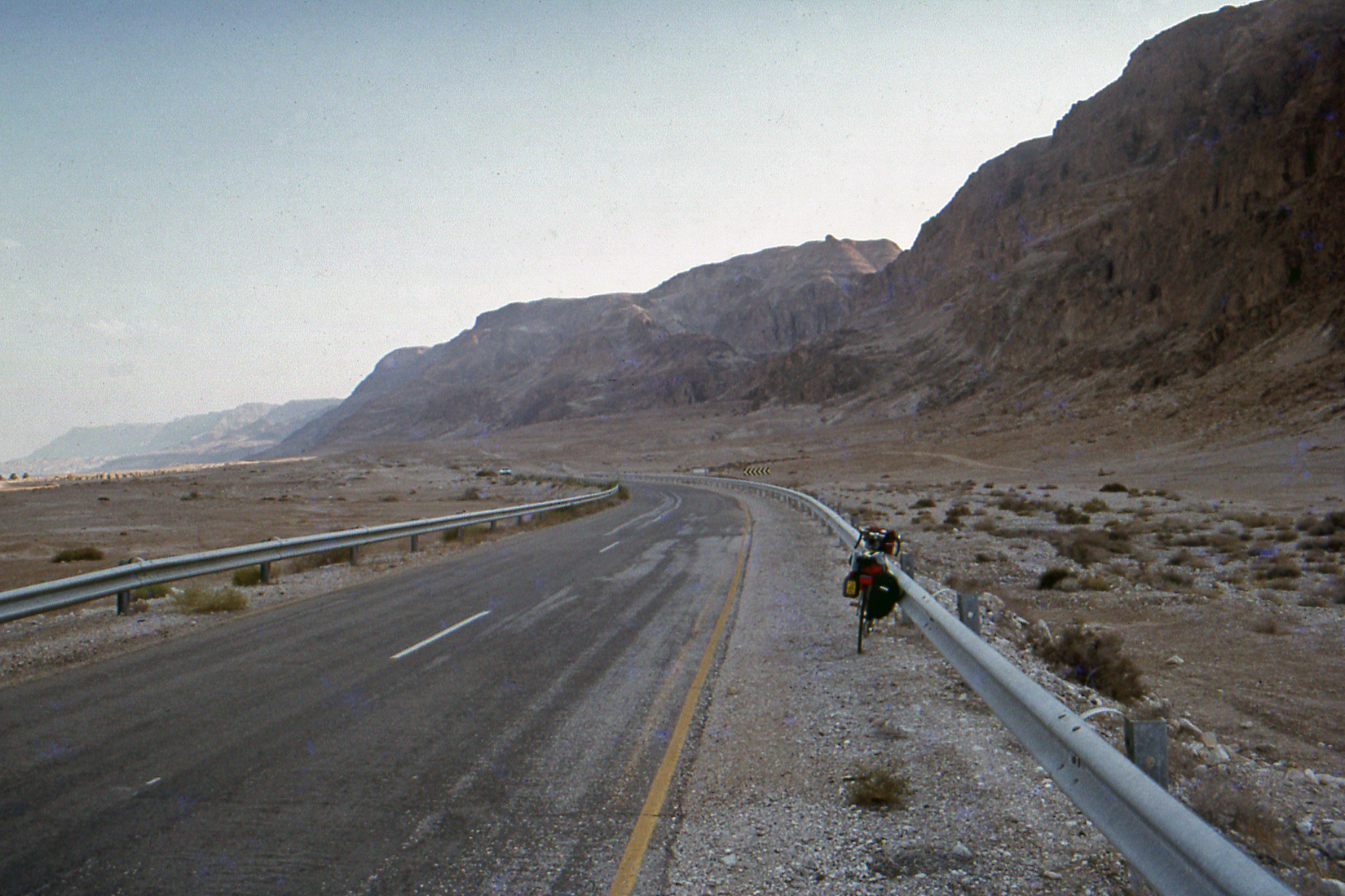 Je hebt het helemaal goed, de weg 90 langs de Dode Zee, dus fietste ik op ca. -400 meter, het laagste punt ter wereld. Een heel opwindende belevenis.