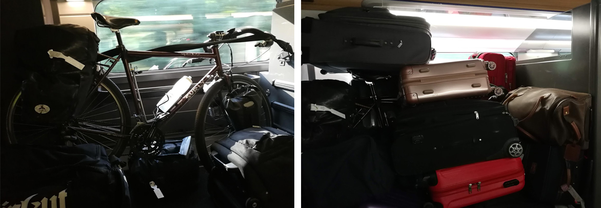 hier.) We boften dat op de stations waar we in een trein moesten stappen, veel reizigers uitstapten. Bovendien stonden we steeds al op het juiste deel van het perron, waardoor we snel in de juiste wagon konden zijn voordat andere reizigers de laatste lege plekken in de rekken vol hadden kunnen gooien. Verpakte fietsen hadden we er niet zonder slag of stoot tussen kunnen krijgen.