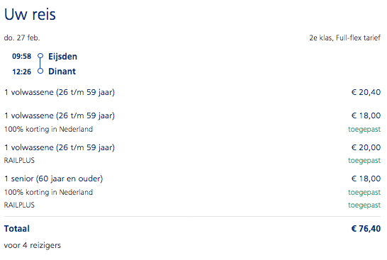 Vergelijk je het NS-Internationaal-tarief voor Visé/Eijsden-grens naar Dinant (wat alleen lukt met een vertrekstation in NL en 100% korting in NL) met het gewone Belgische tarief dan kost dat resp € 18,-- en € 15,70 ... die laatste grenskilometer blijft dus onredelijk duur. Een Belgisch-tarief-kaartje voor Maastricht - Dinant komt overigens op € 17,70 (daar kom je op uit als je Eijsden intypt), bij NS-Internationaal kost Eijsden-Dinant € 20,40 en Maastricht-Dinant zelfs € 21,--.