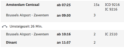 PS Bahn.de lijkt de reis naar Dinant te willen saboteren, de voordelige overstap in Zaventem moet je forceren, Bahn.de laat je een keer extra overstappen, en dus tweemaal met minder overstap-tijd.