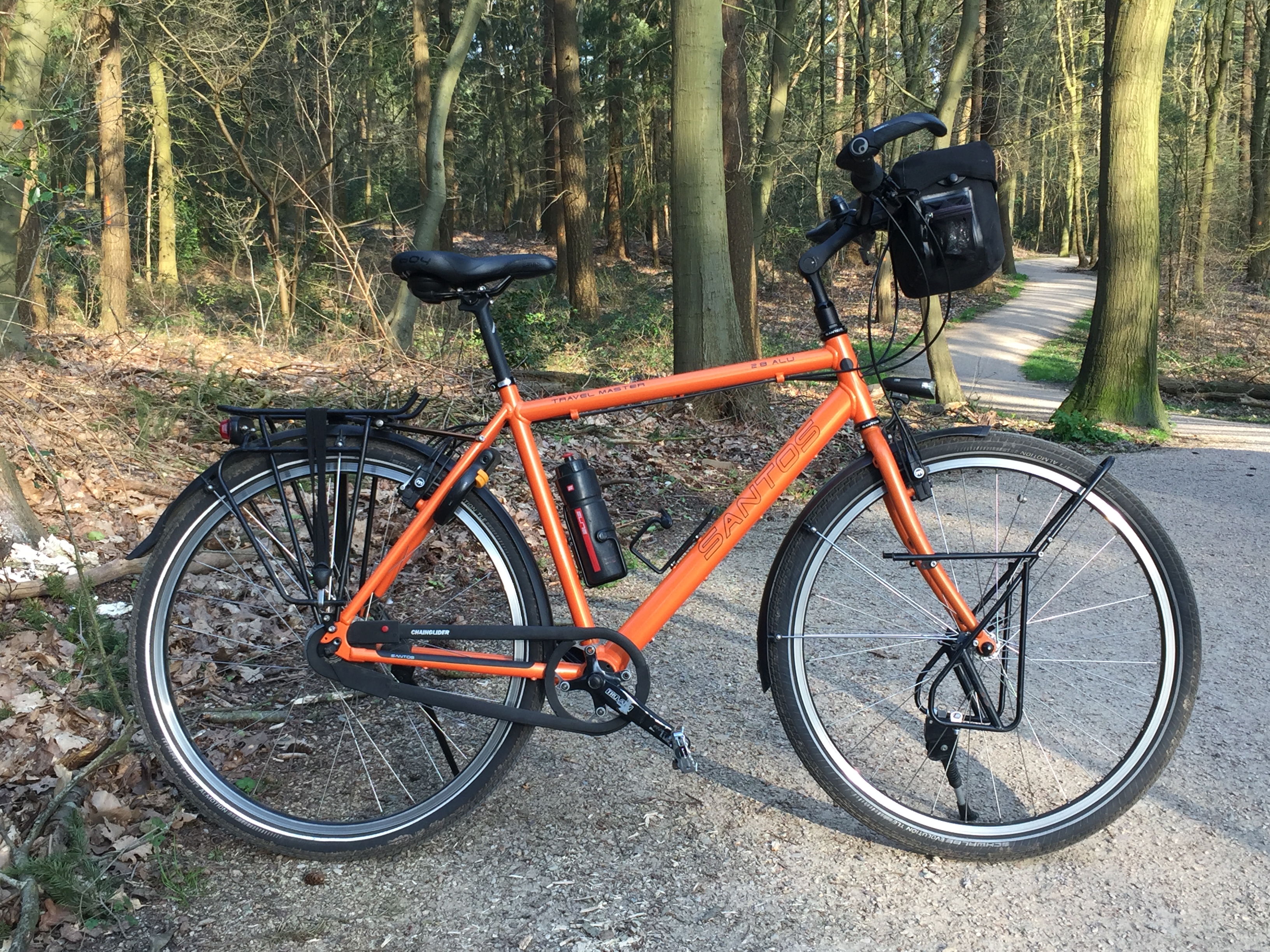 Staar je niet dood op de naam van de fiets. Ik heb een hele slechte santos gehad, (uitgebroken bevestiging bagagedrager, alles versleten (en heel dure onderdelen om te vernieuwen...- ook belangrijk om te beschouwen)), derailleur pad van aluminium en iets verbogen etc, en een hele goede gazelle, een stalen formula randonneur die elke vakantie aan kan.
