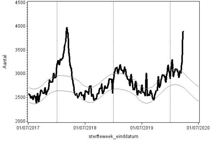 Wat wel goed mogelijk is, is om de totale hoeveelheid overledenen bij te houden, zodat je naderhand kunt zien hoeveel oversterfte er is geweest, en of er na de epidemie ondersterfte optreedt. Maar zelfs dat is geen strakke analyse omdat sterftecijfers altijd flink fluctueren. Zie de onderstaande grafiek met sterftegegevens. (Bron: AD: https://www.ad.nl/binnenland/cbs-vermoe ... ~a2b1c2cb/)