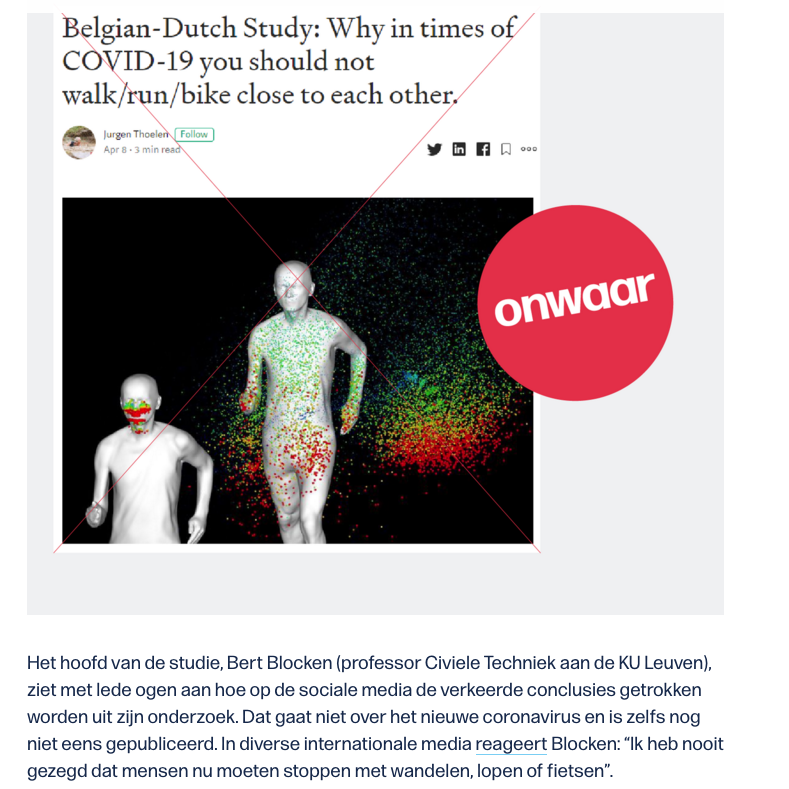 De afstandsregel van 1,5 meter zou dus vooral effectief zijn bij mensen die stilstaan. Volgens de onderzoekers moeten mensen tijdens het wandelen zeker 4 à 5 meter afstand te houden. Bij joggen en rustig fietsen 10 meter en bij hard fietsen zeker 20 meter.' Bron NOS