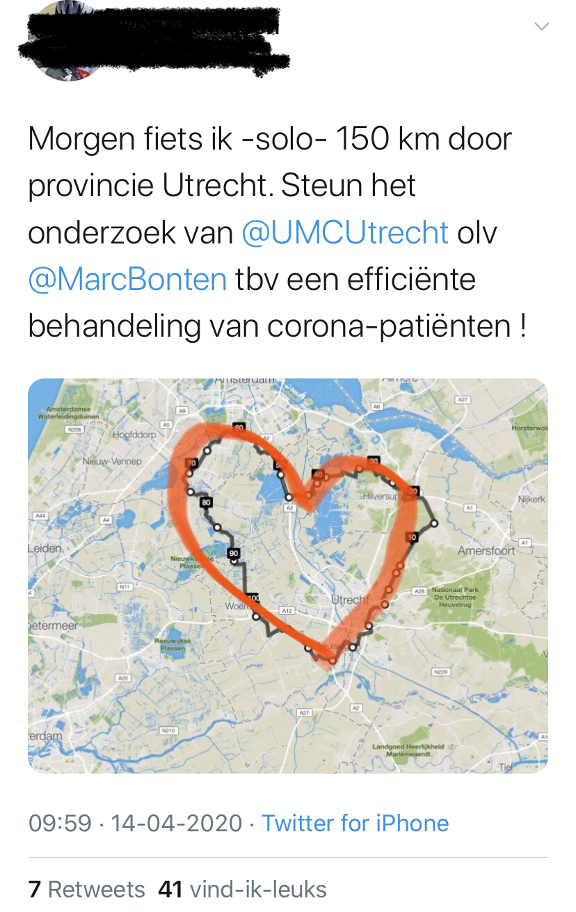 En als je dan toch een frisse neus wilt halen dan kan dat toch zoals de Fietsersbond dat aangeeft, namelijk dat het wenselijk is om je fietsrondje beperkt te houden tot een rondje om het dorp (bij wijze van spreken), dan is dat toch een duidelijk verhaal?